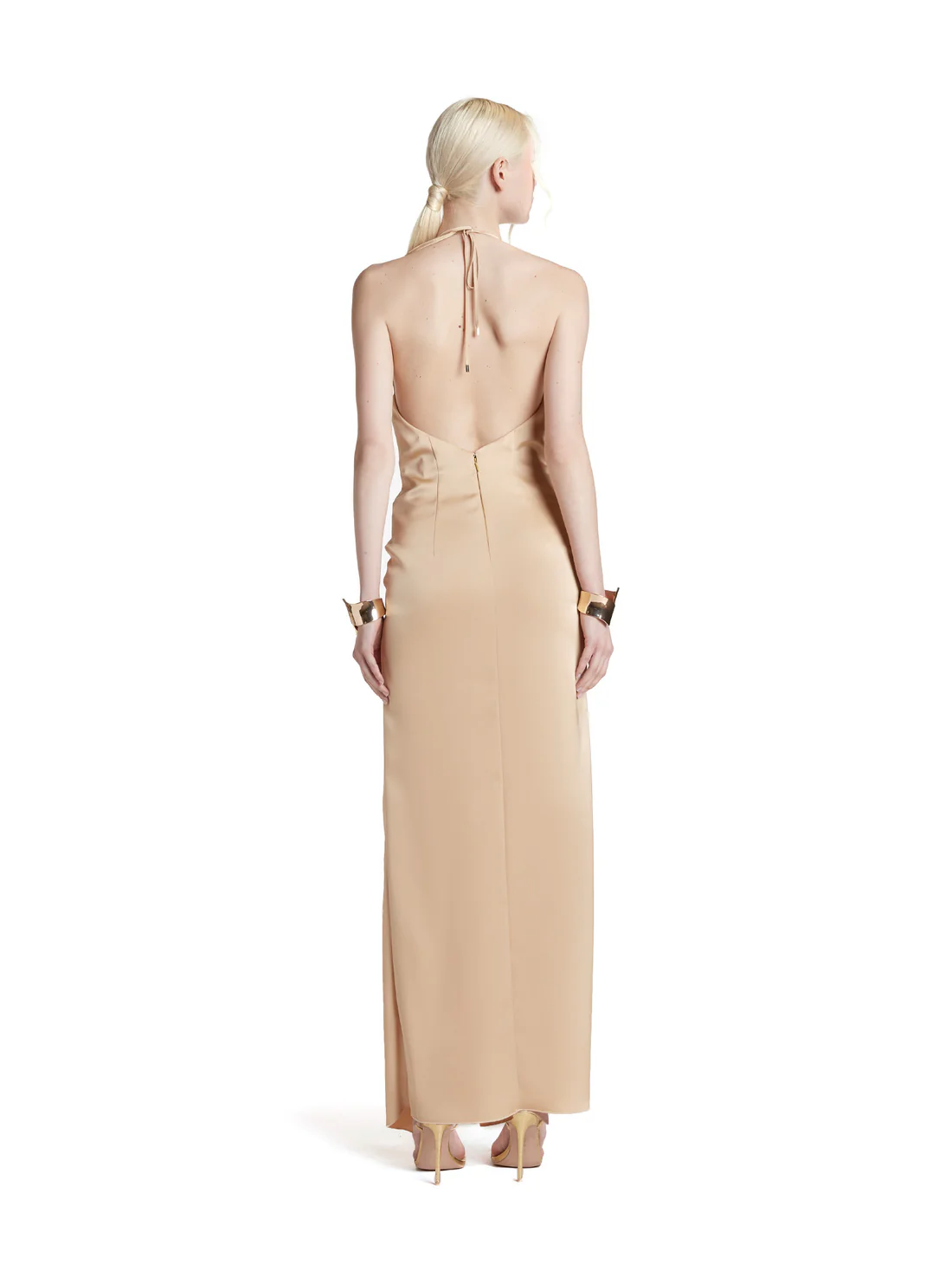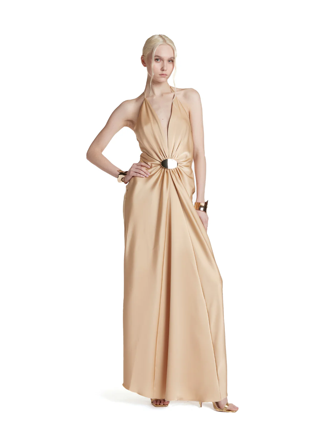 Abito in raso lungo con scollo profondo, placca in metallo.