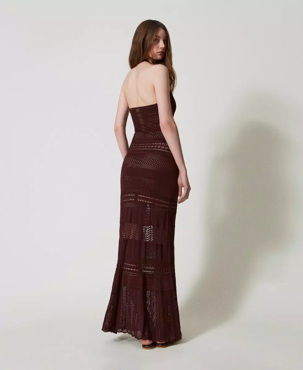 Abito lungo in maglia di misto viscosa con lavorazione punzonata a disegni geometrici all over. Ha scollo halter con schiena scoperta, placchetta logo Oval T sul retro, linea fitted.
