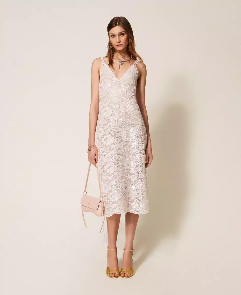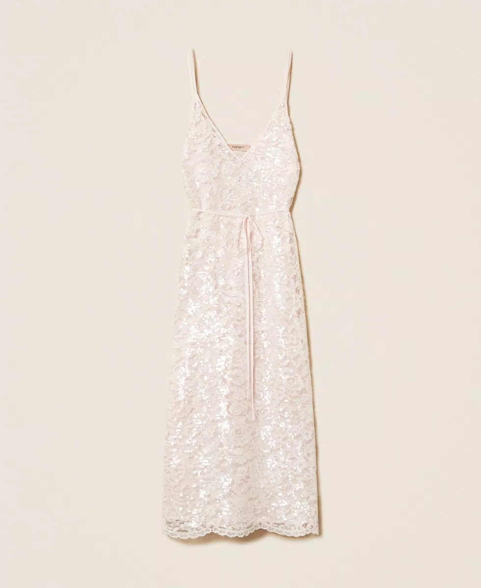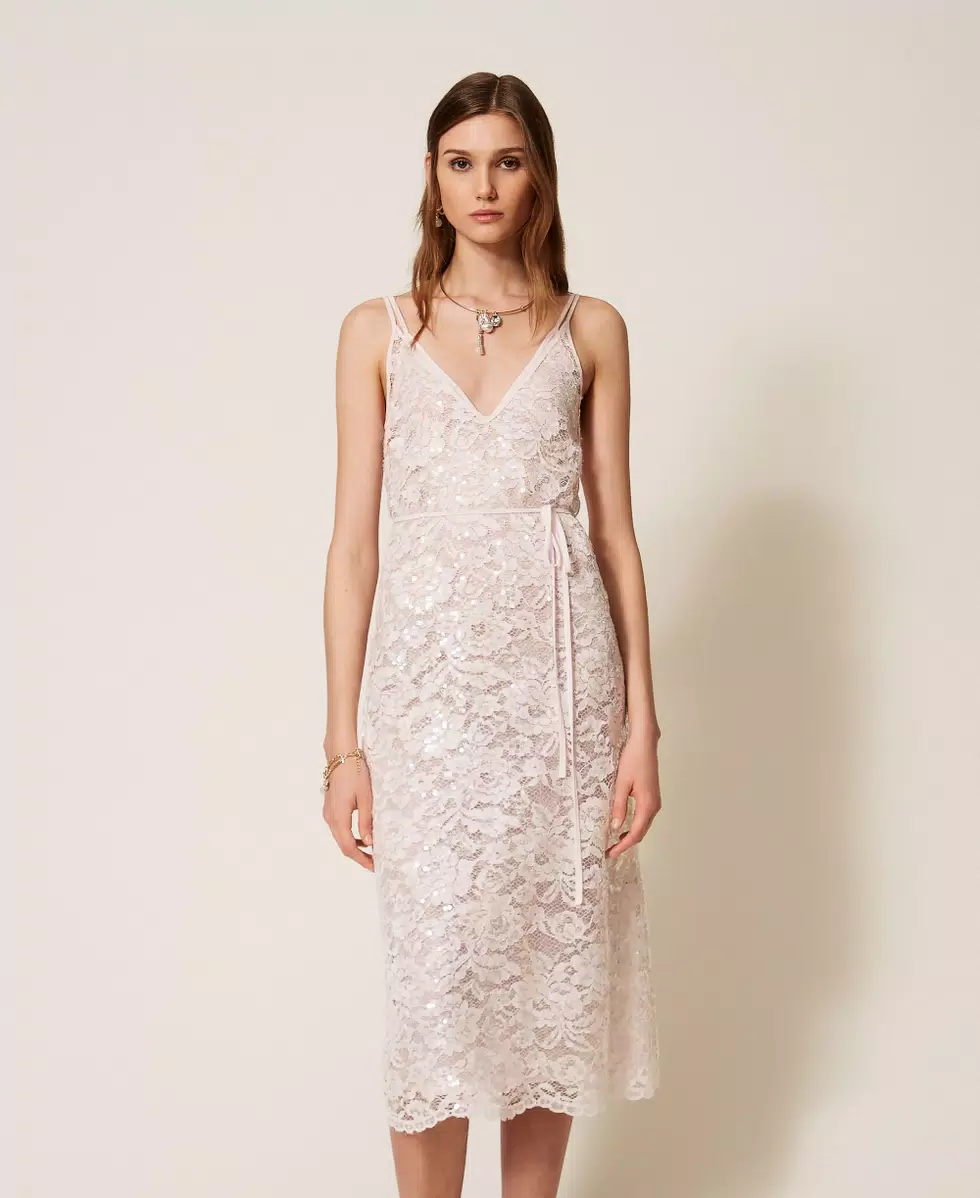 Abito longuette in pizzo con paillettes trasparenti. Ha spalline sottili, chiusura con zip, sottoveste in crêpe de Chine, cintura rimovibile in vita, linea morbida.