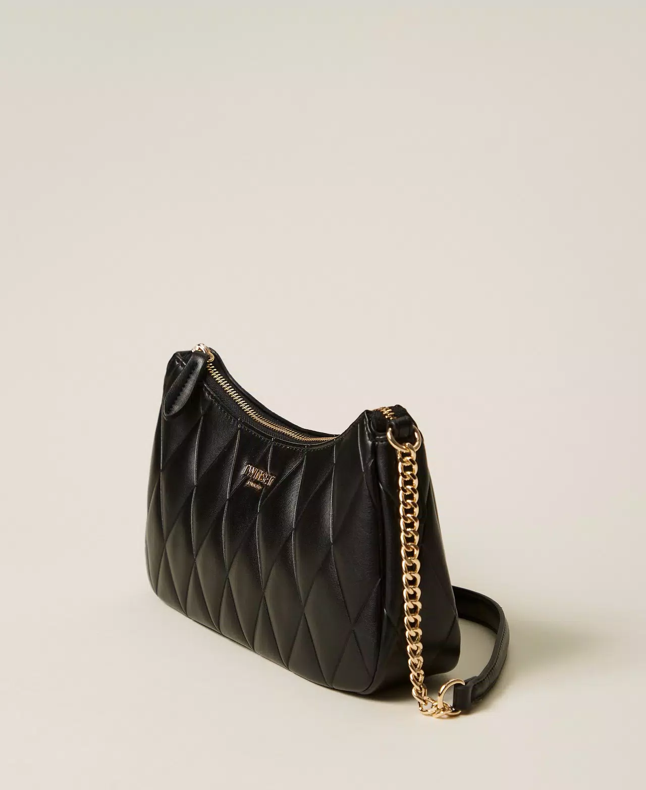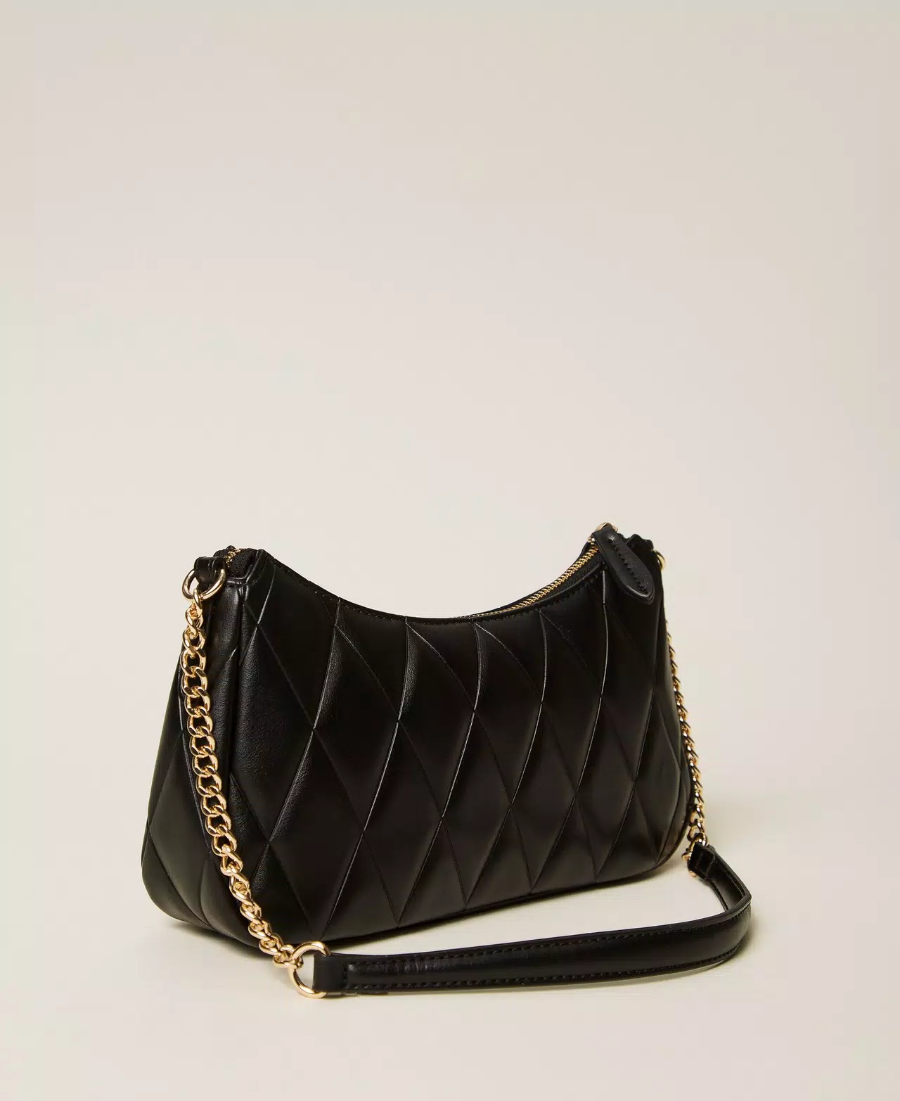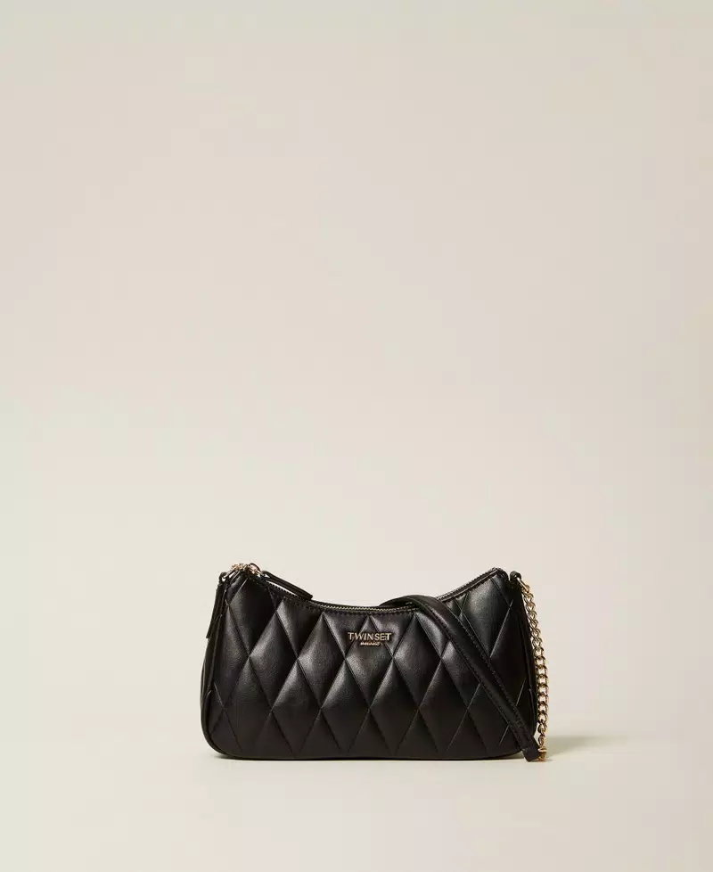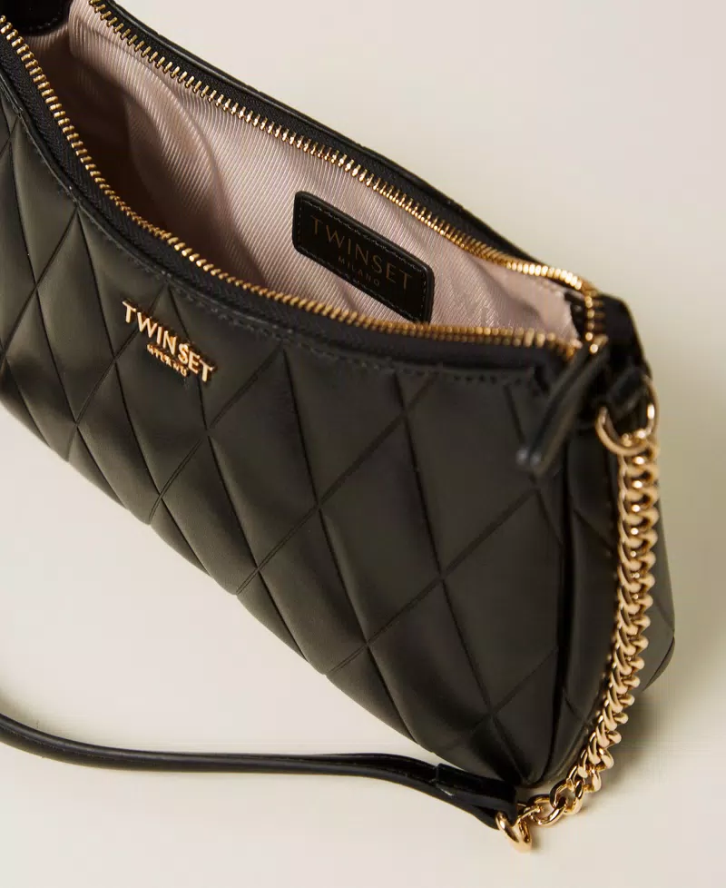 Borsa a tracolla effetto nappa di vitello liscio morbido con lavorazione quilted realizzata con stampa a caldo. Ha chiusura con zip, logo lettering in metallo, tracolla con inserti in catena, foderata.