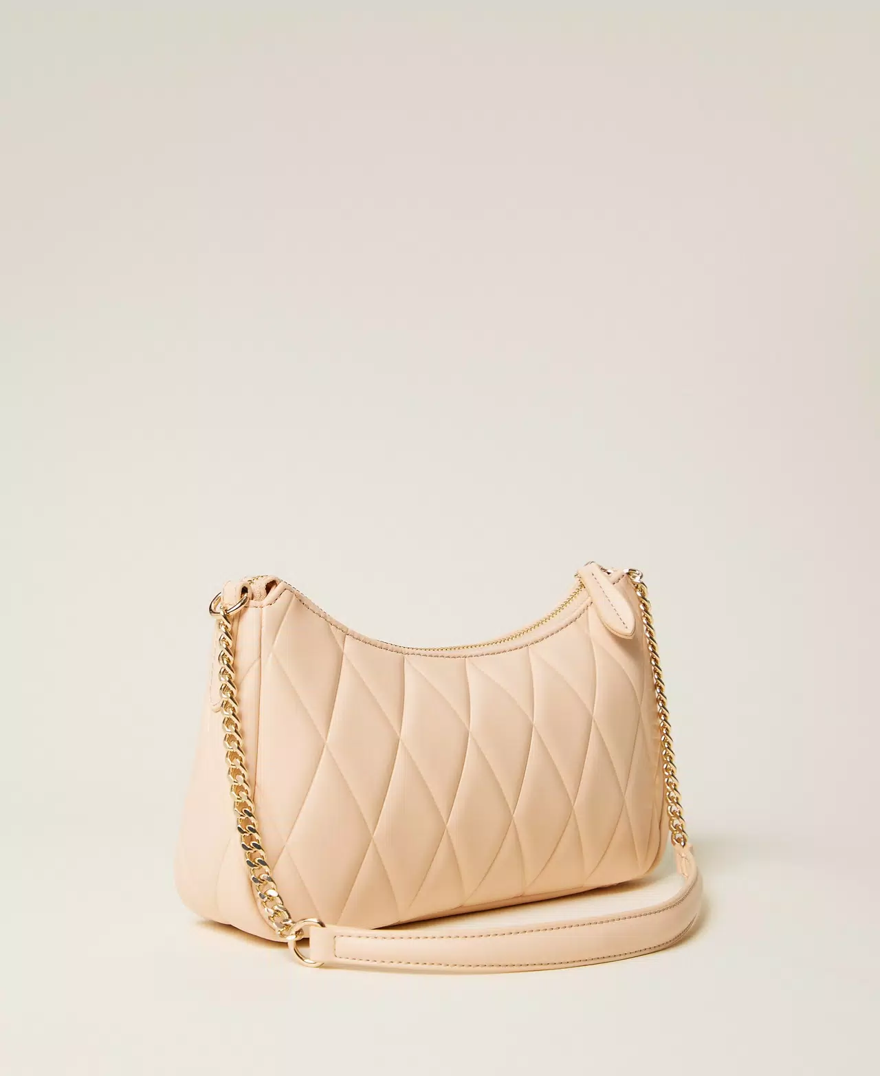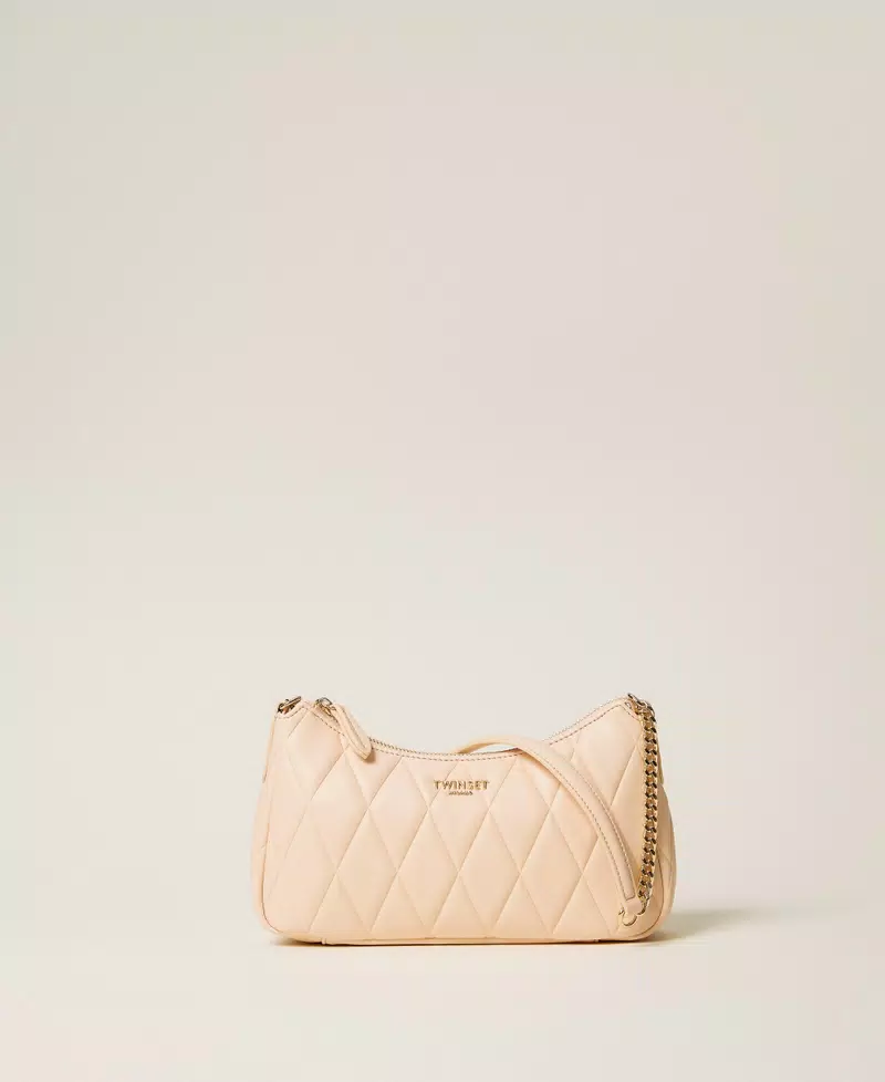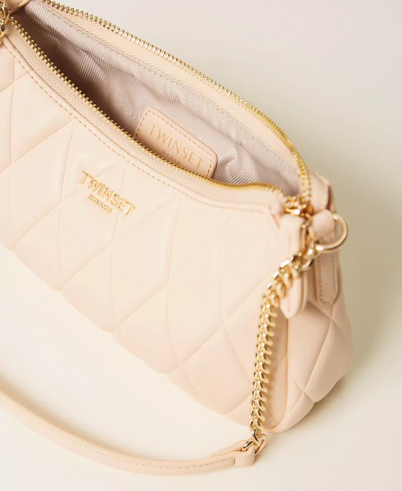 Borsa a tracolla effetto nappa di vitello liscio morbido con lavorazione quilted realizzata con stampa a caldo. Ha chiusura con zip, logo lettering in metallo, tracolla con inserti in catena, foderata.
