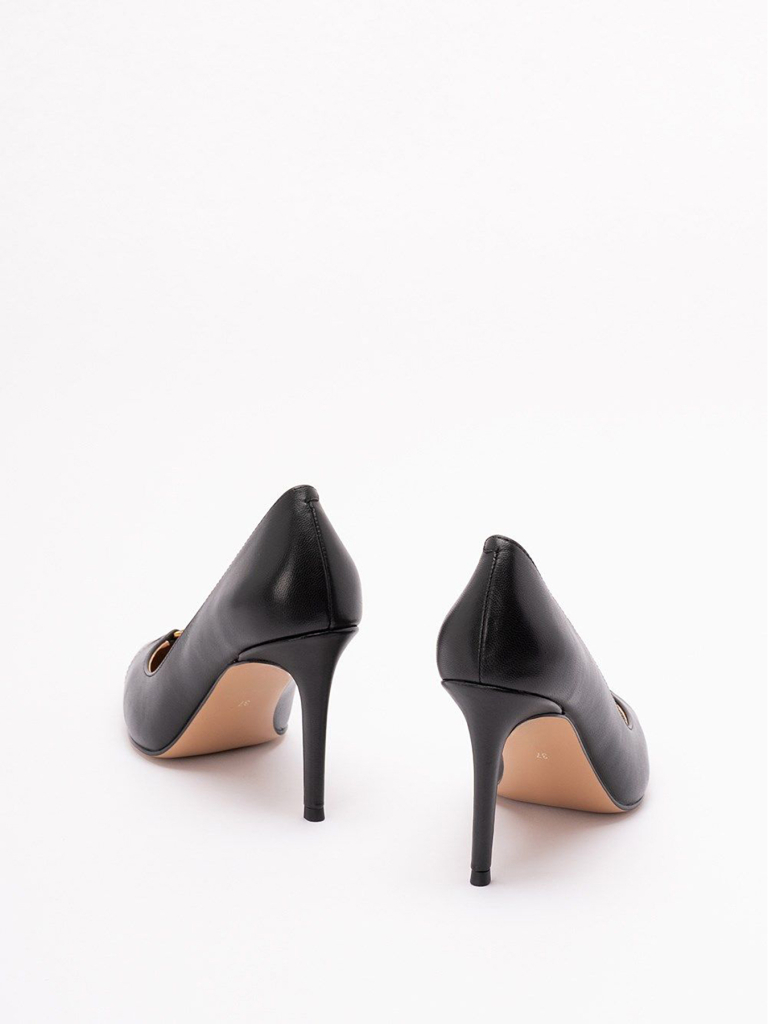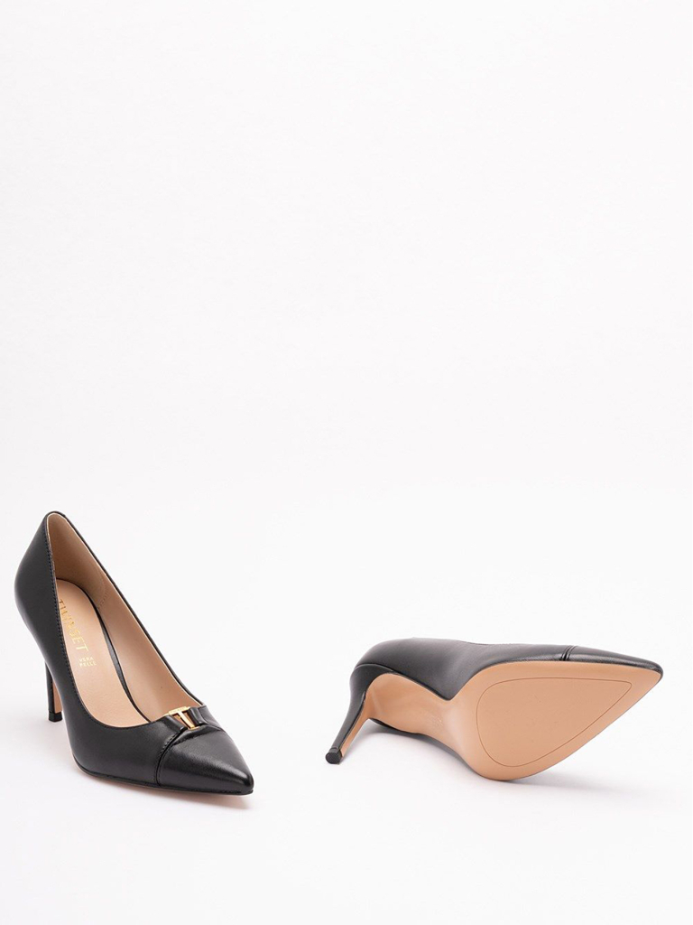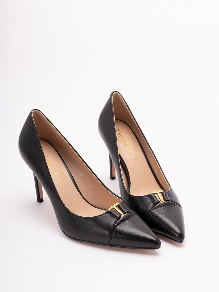 Décolleté in pelle di vitello, dalla punta sfilata, con logo in metallo, tacco a stiletto e fondo in tunit.