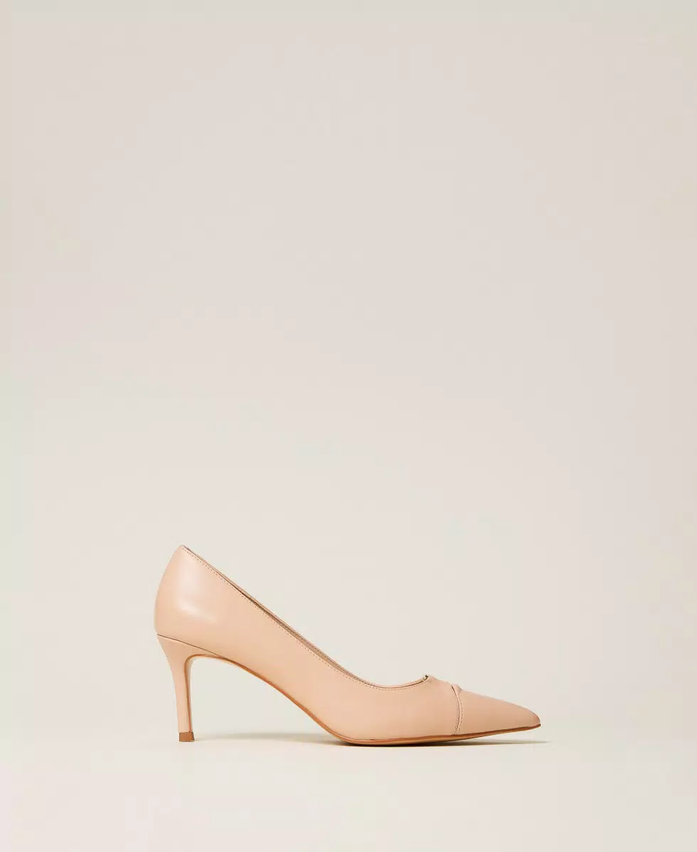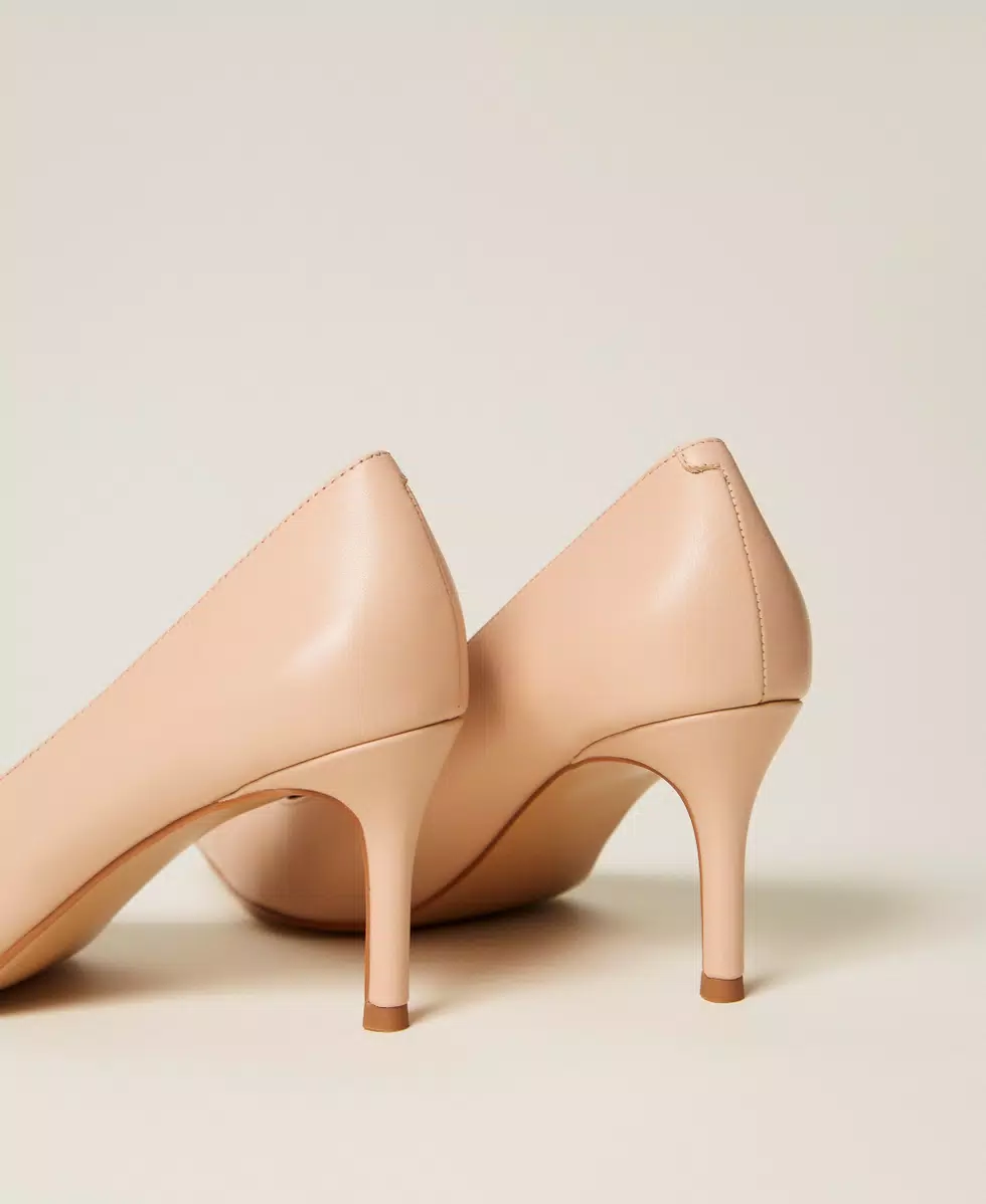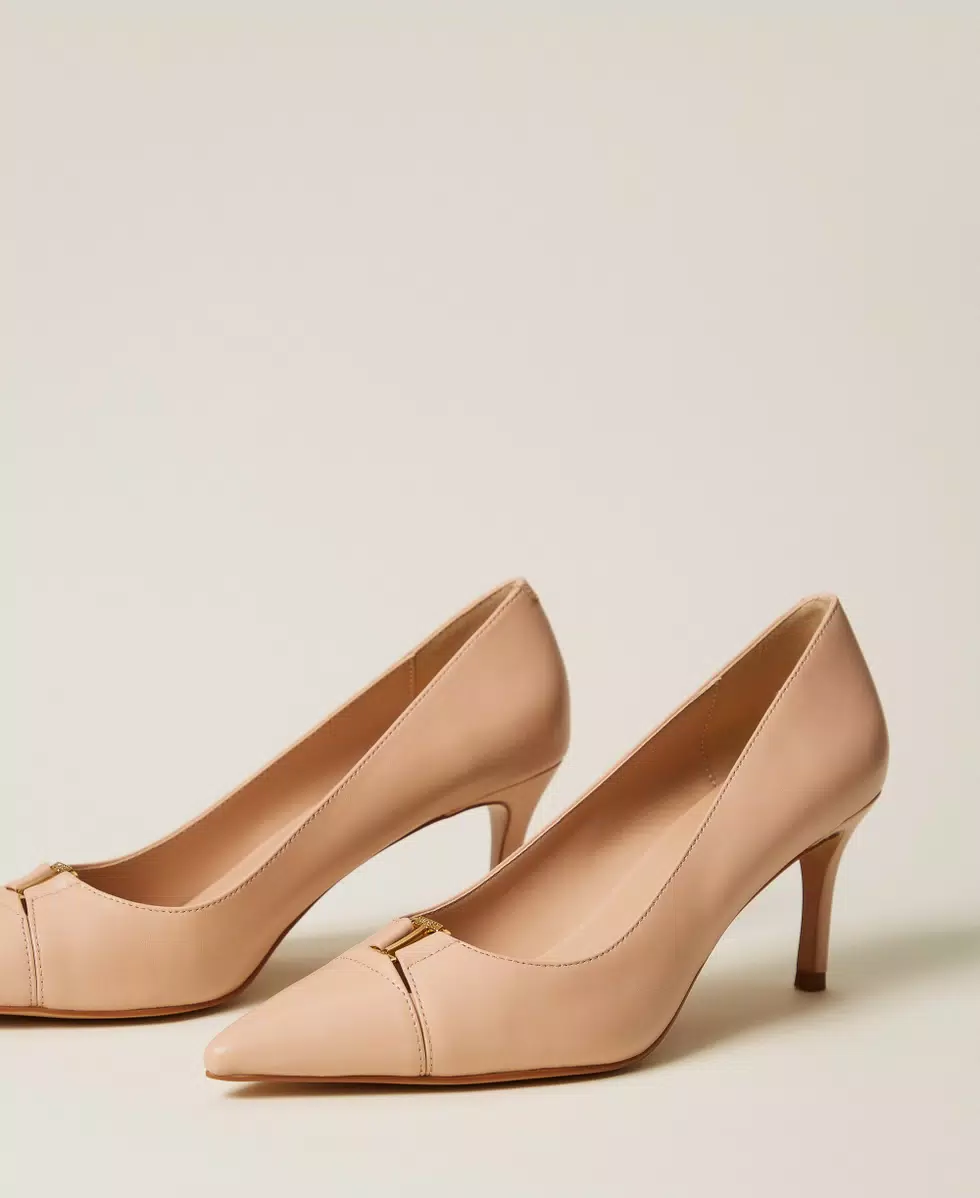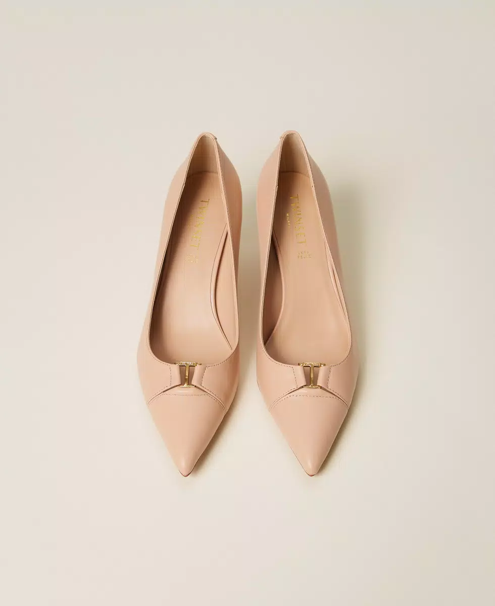 Décolleté in pelle di vitello, dalla punta sfilata, con logo in metallo, tacco a stiletto e fondo in tunit.