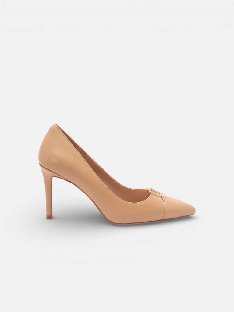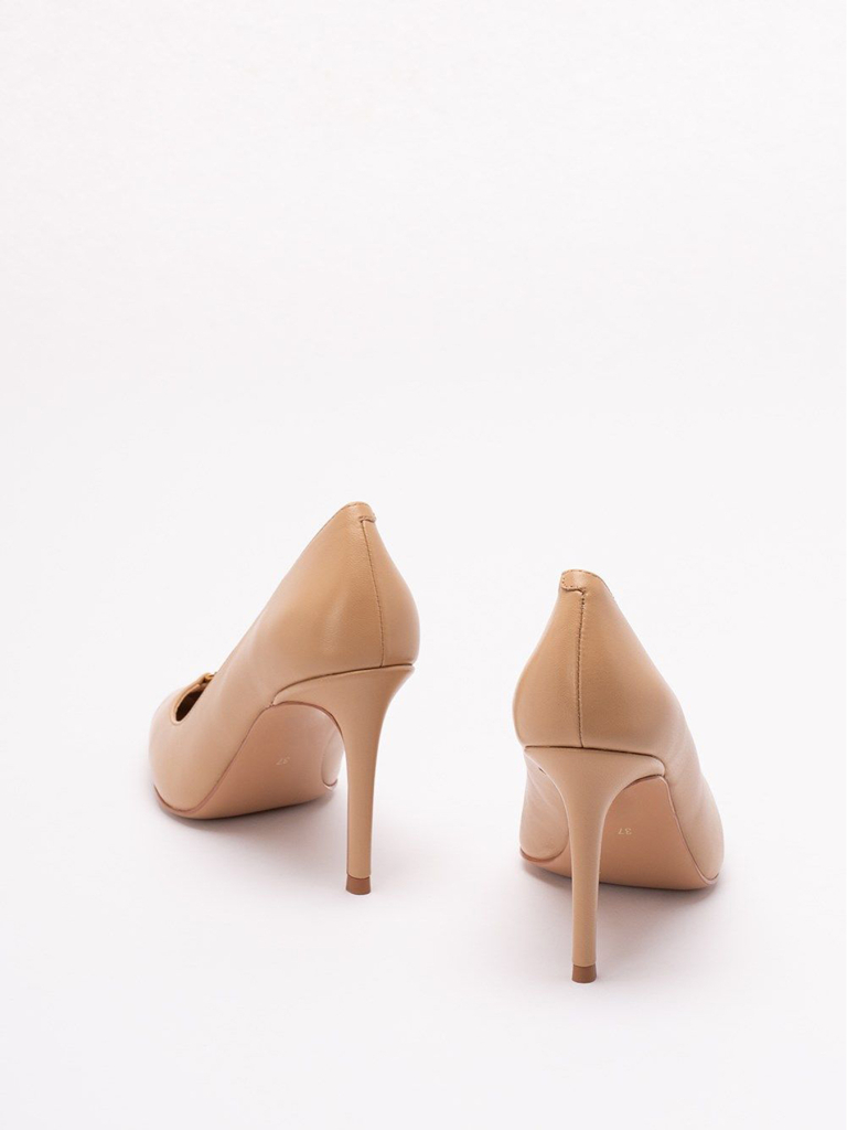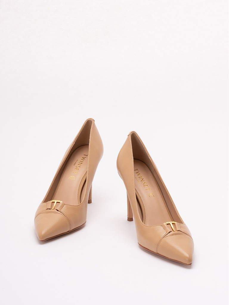 Décolleté in pelle di vitello, dalla punta sfilata, con logo in metallo, tacco a stiletto e fondo in tunit.
