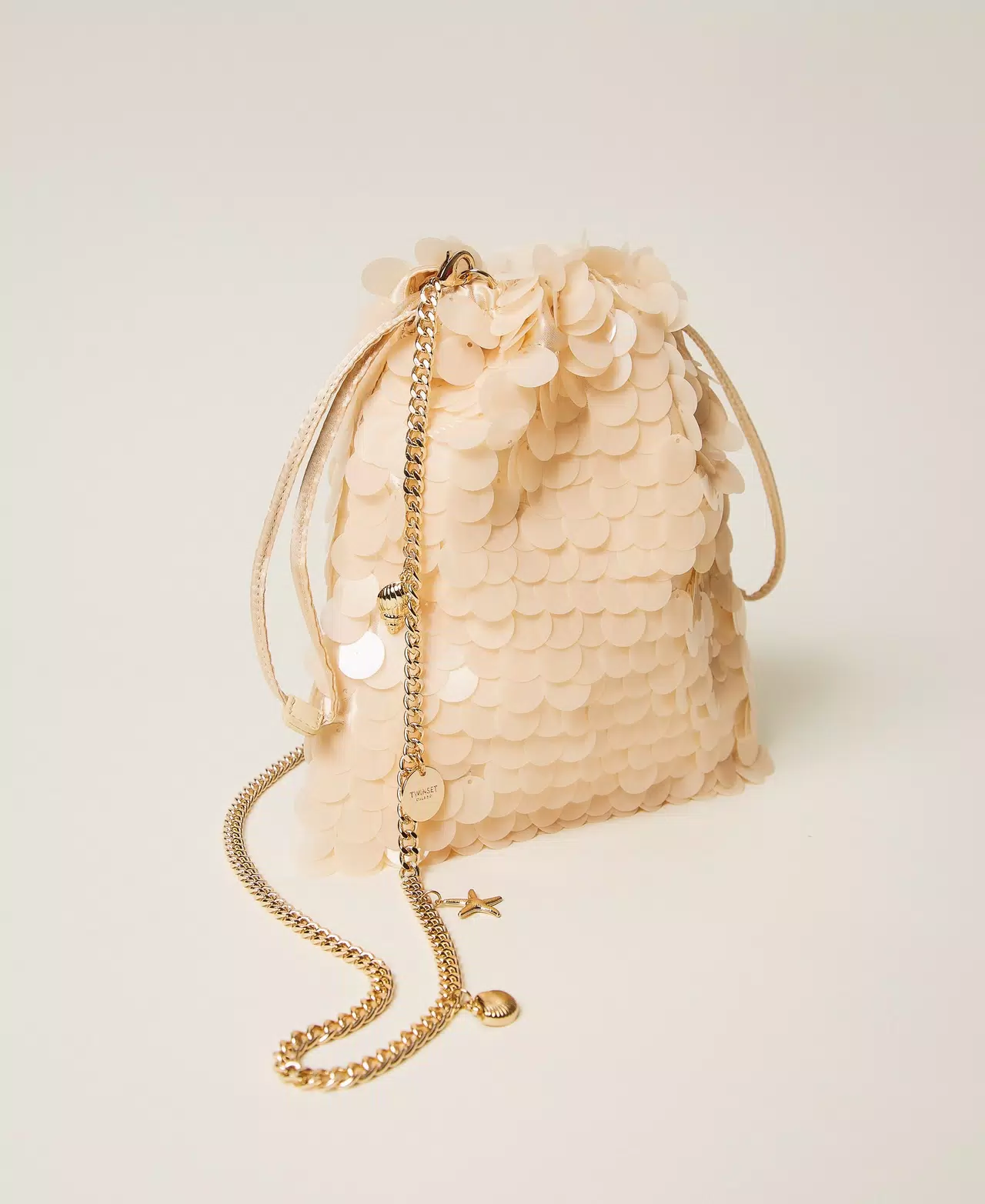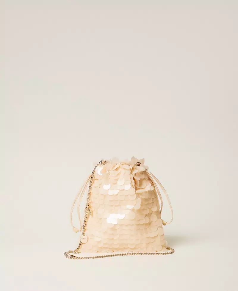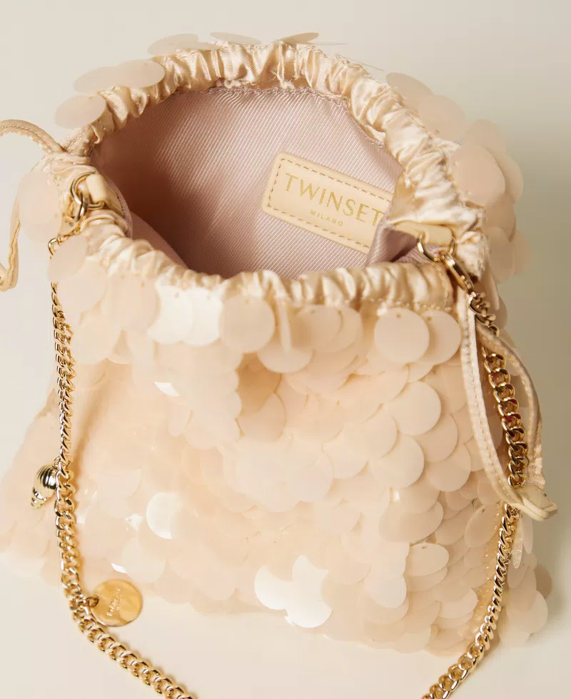 Pochette a sacchetto in raso lucido con ricamo di maxi paillettes in tinta. Ha chiusura con coulisse, tracolla rimovibile in catena con charms applicati e placchetta con logo.