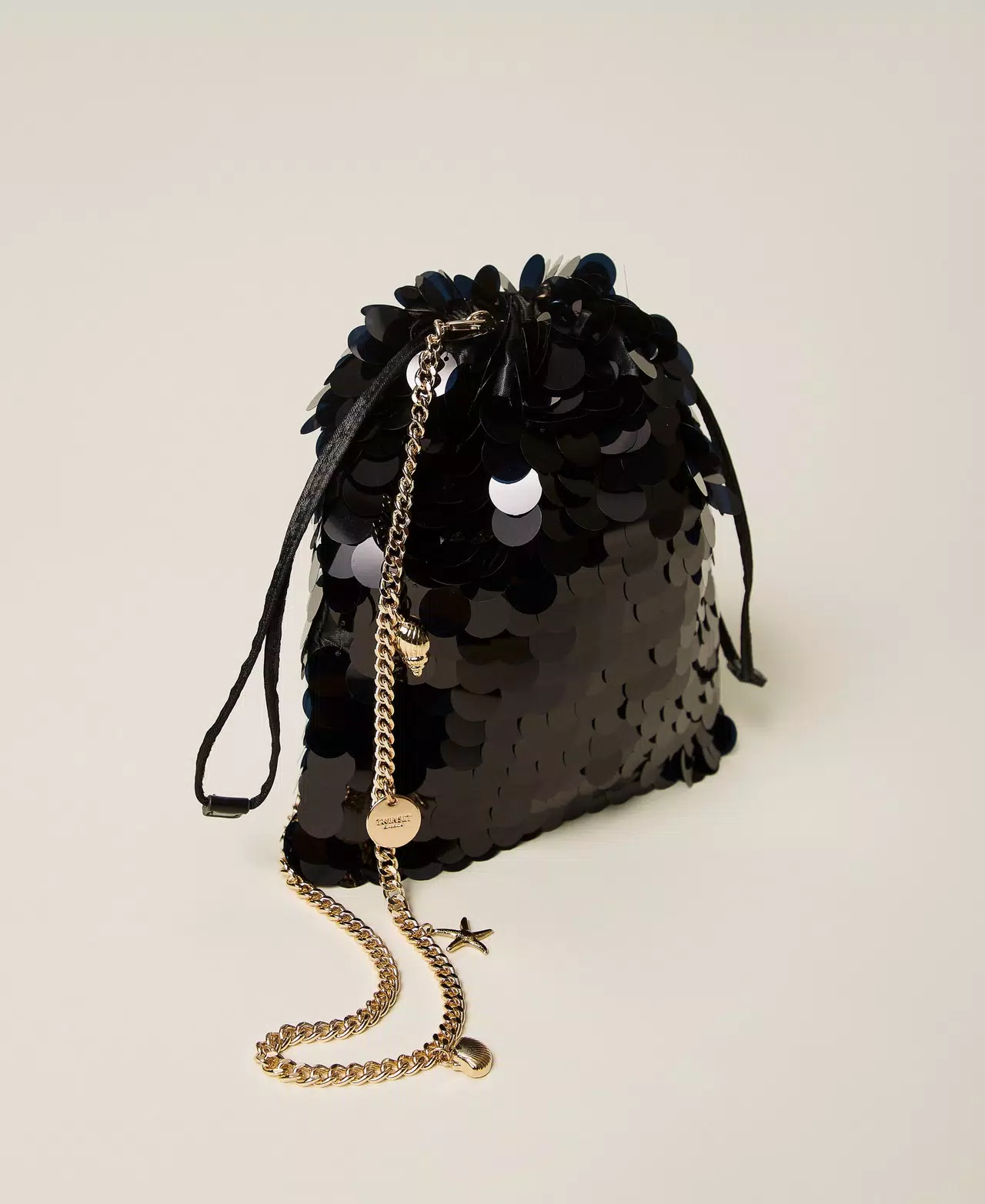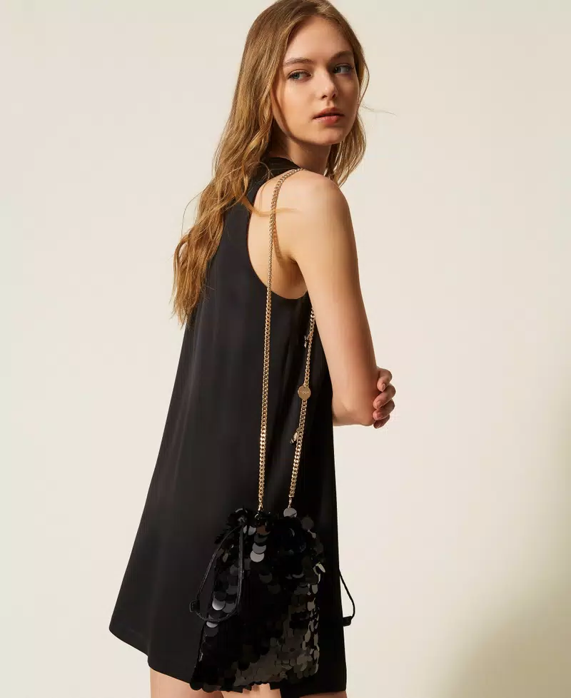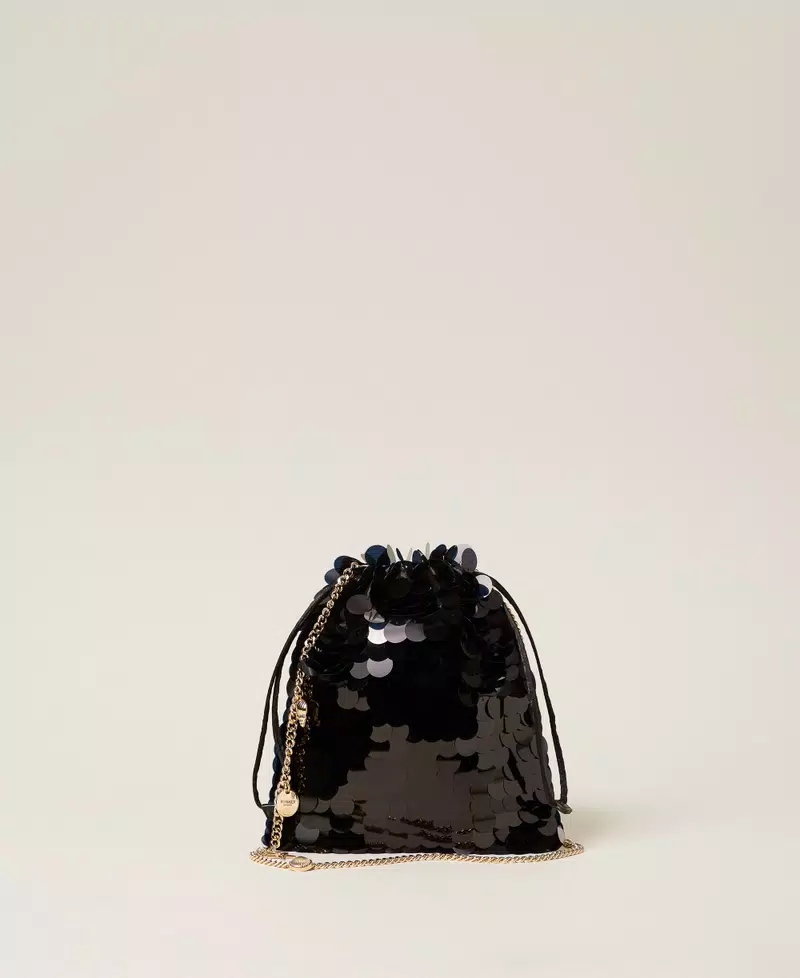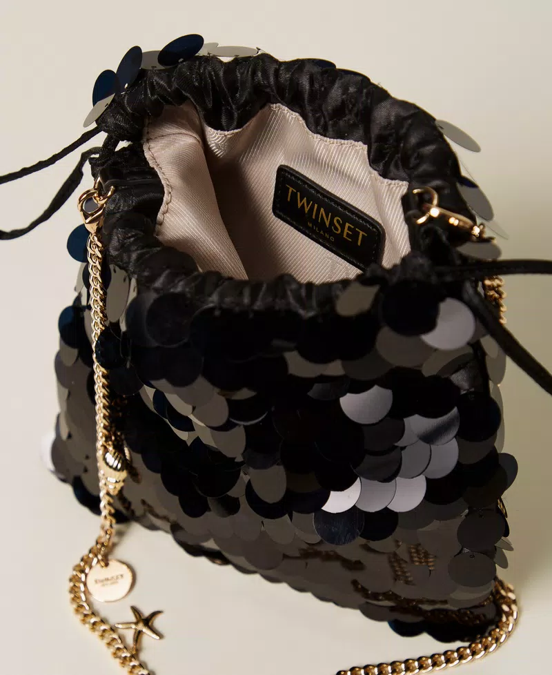 Pochette a sacchetto in raso lucido con ricamo di maxi paillettes in tinta. Ha chiusura con coulisse, tracolla rimovibile in catena con charms applicati e placchetta con logo.