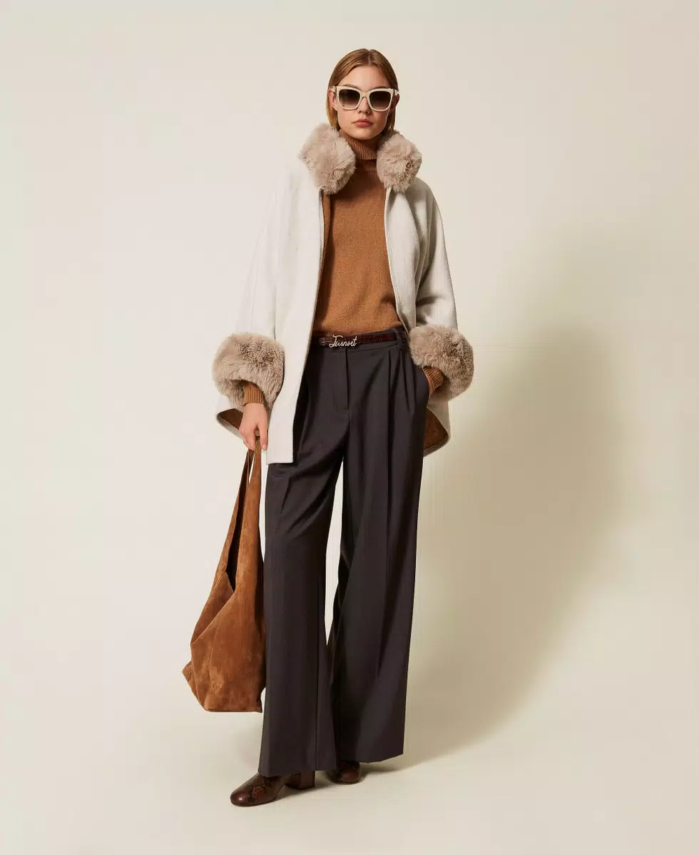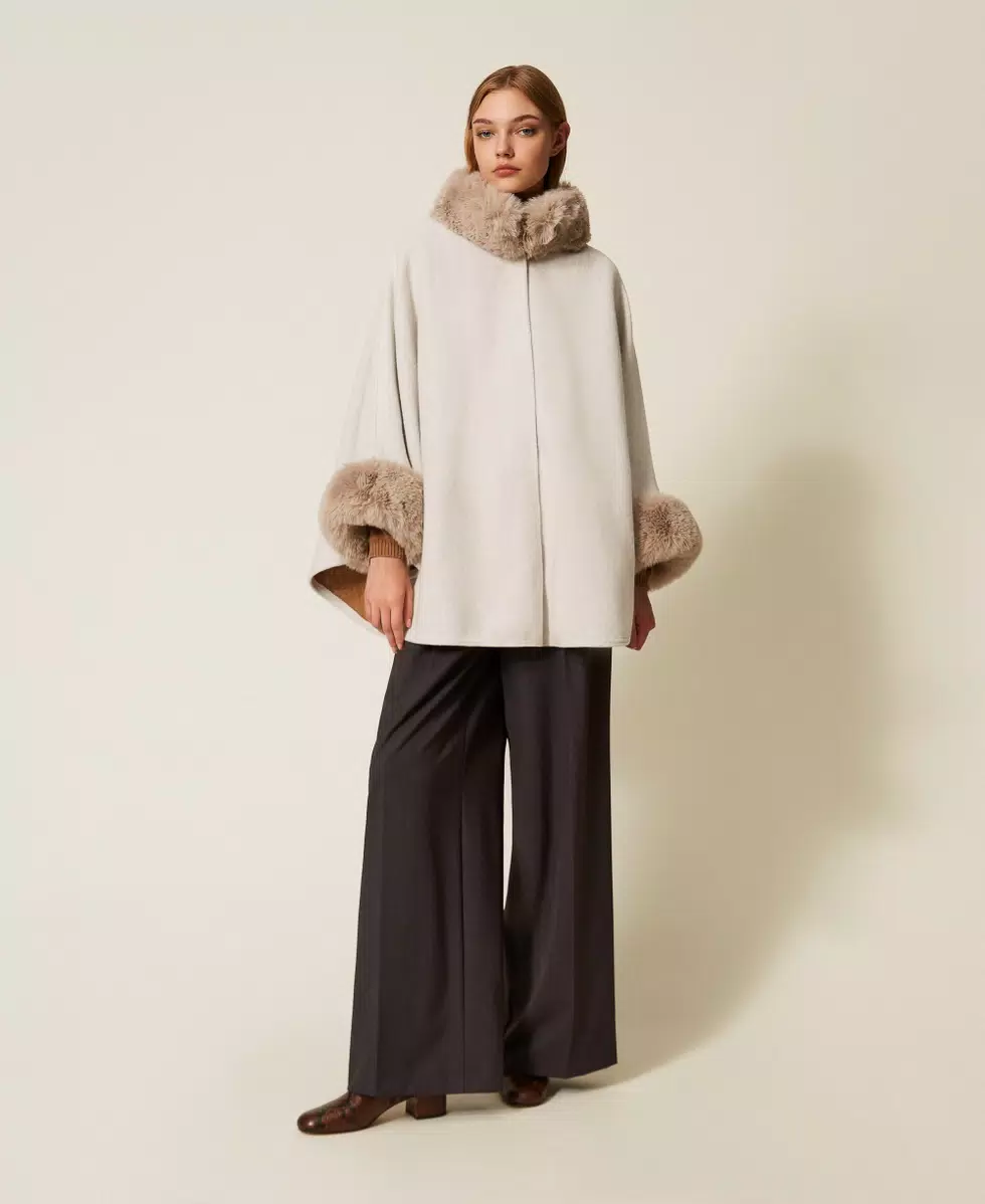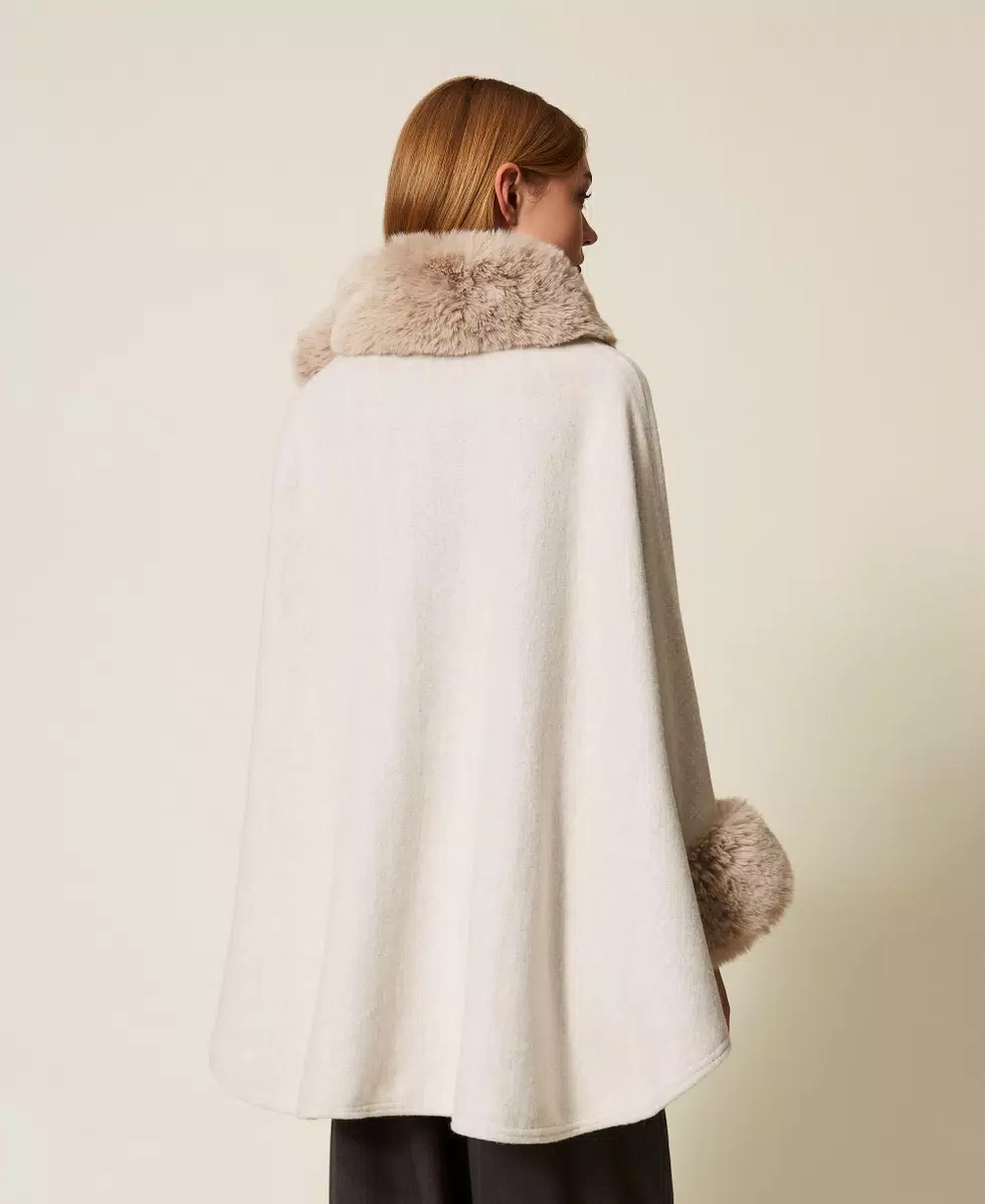 Poncho in panno con collo e polsi in pelliccia sintetica. Ha chiusura con gancio al collo e maniche lunghe.