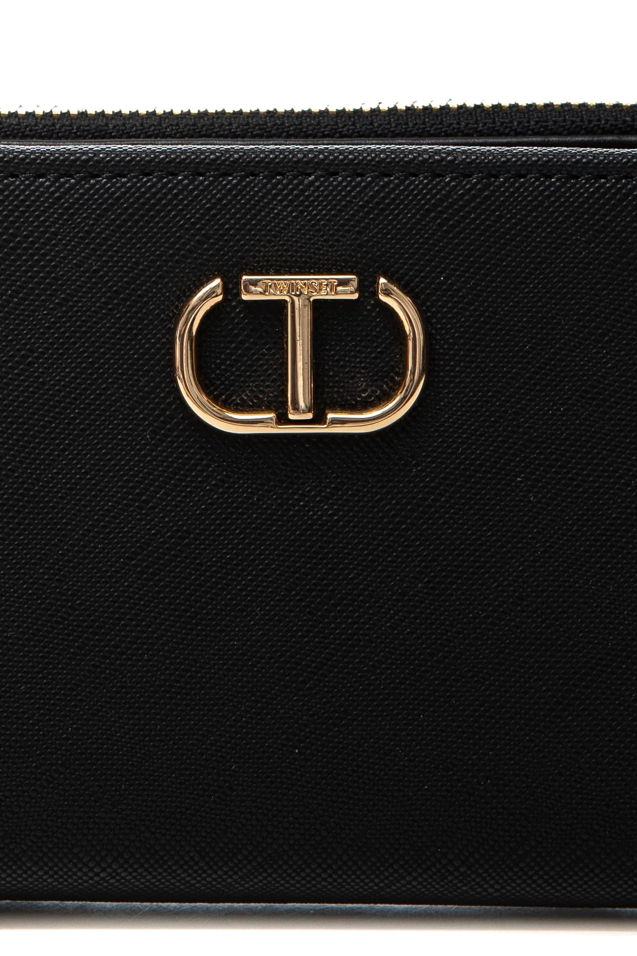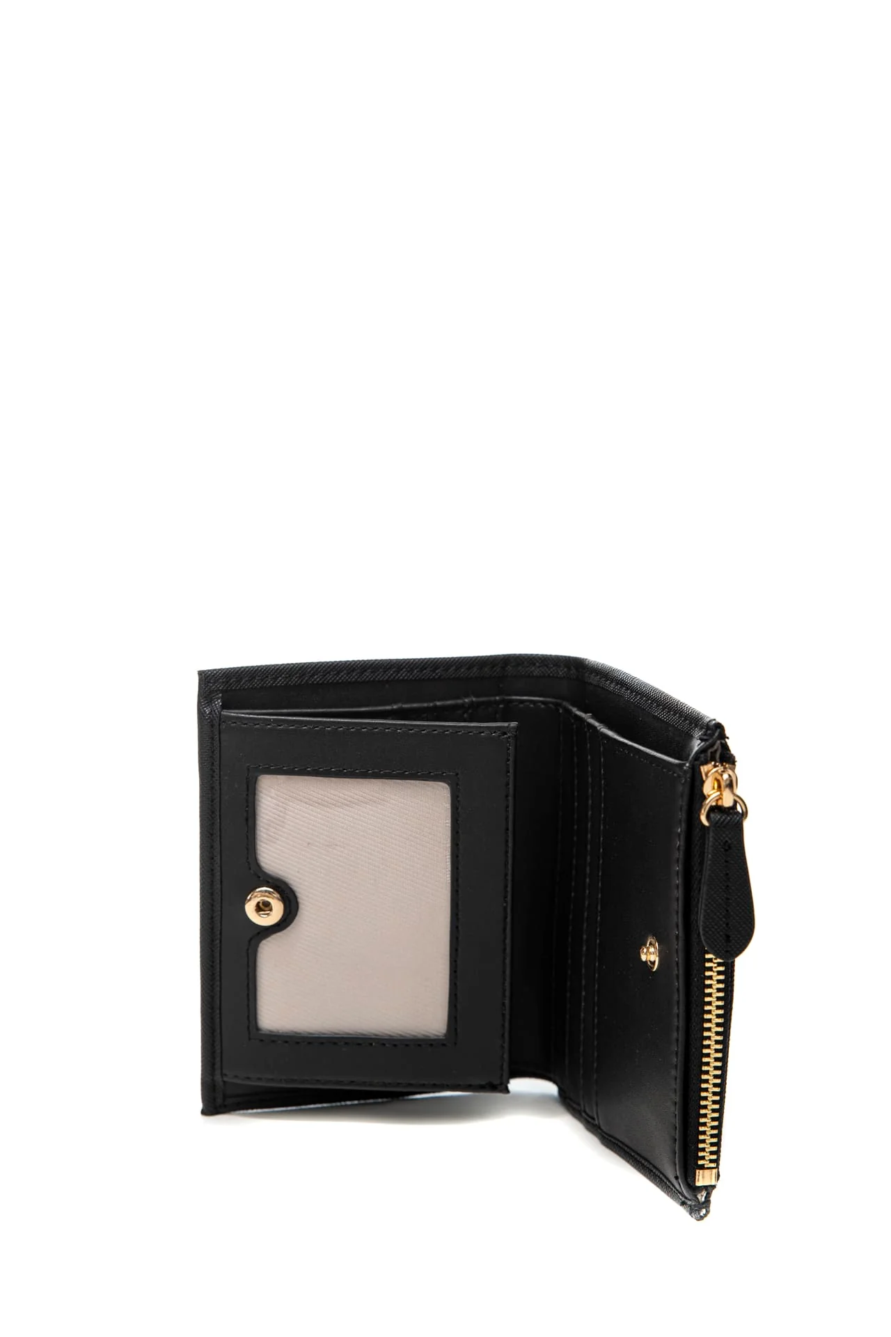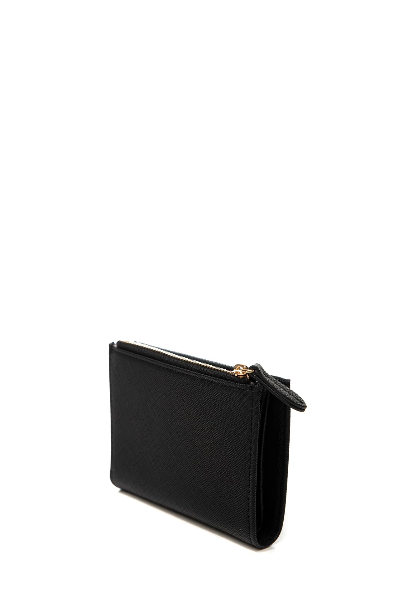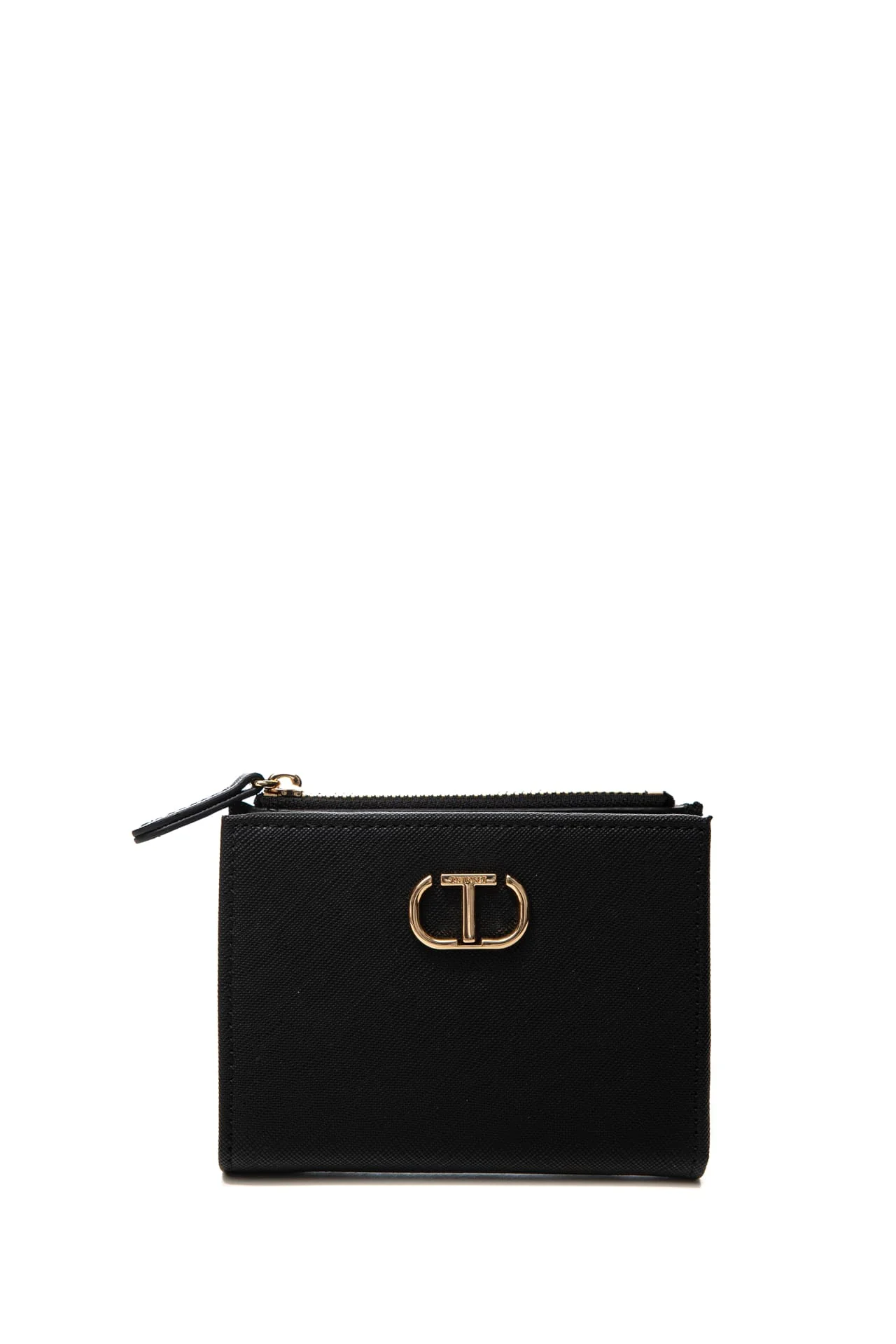 Portafoglio effetto pelle con grana saffiano e trattamento antigraffio, logo Oval T in metallo, tasca portamonete con zip, comparto interno con portacarte di credito e porta documenti, chiusura con bottone a pressione.
