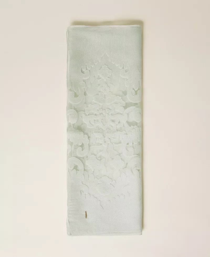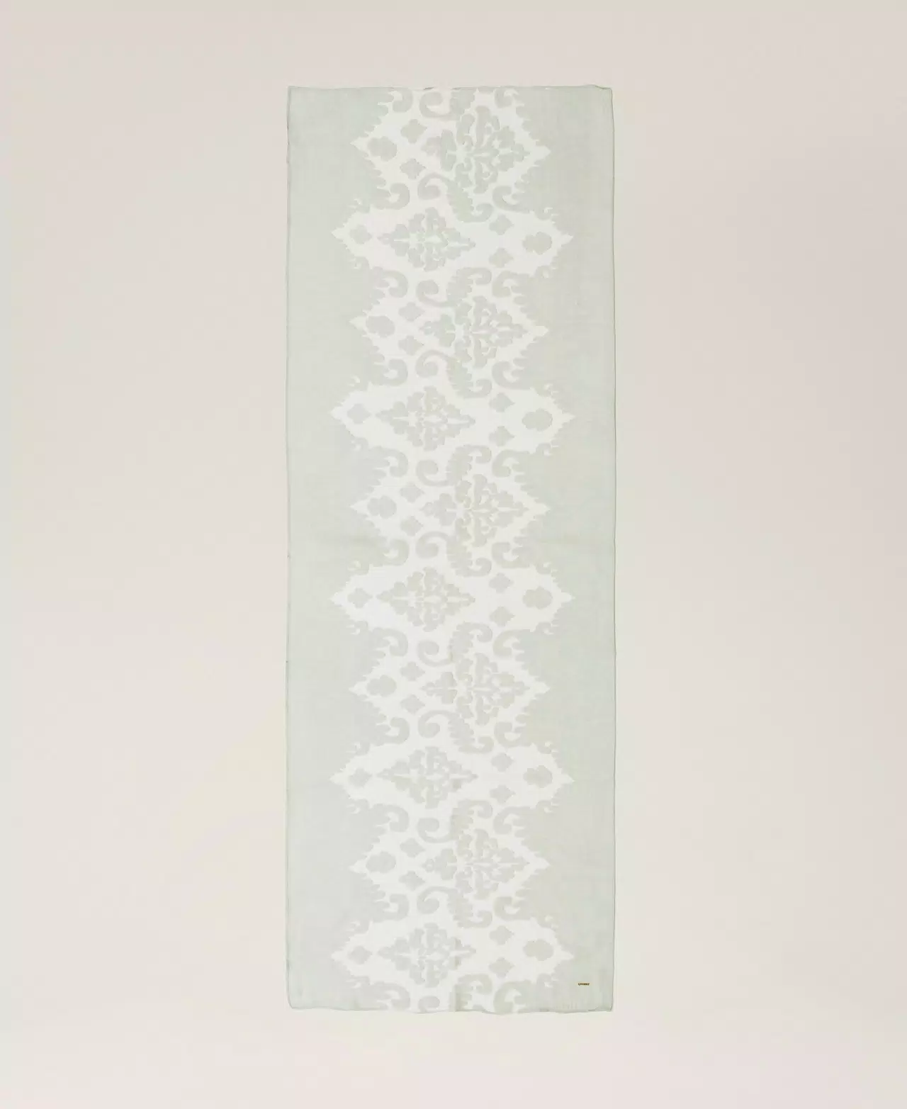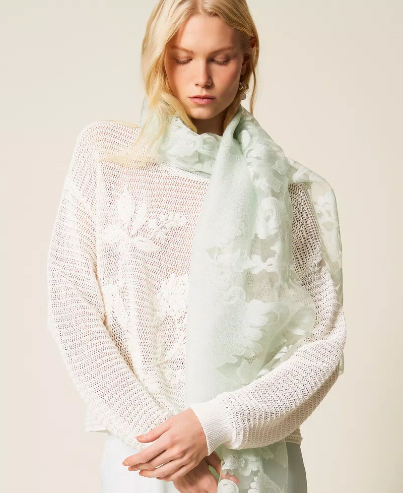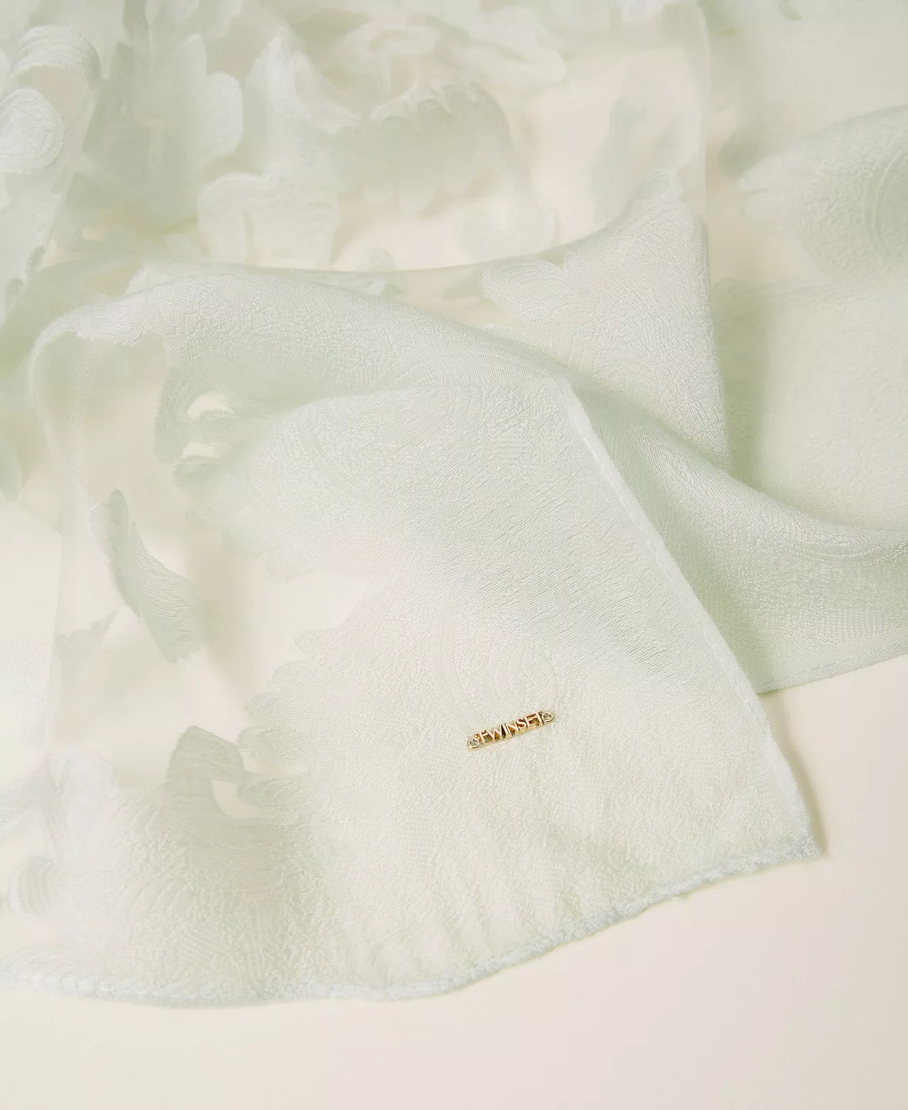 Stola in pizzo intarsiato con trasparenze personalizzata da targhetta logo.