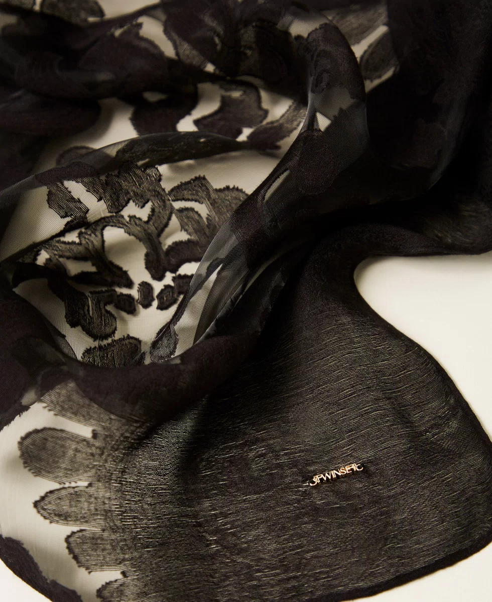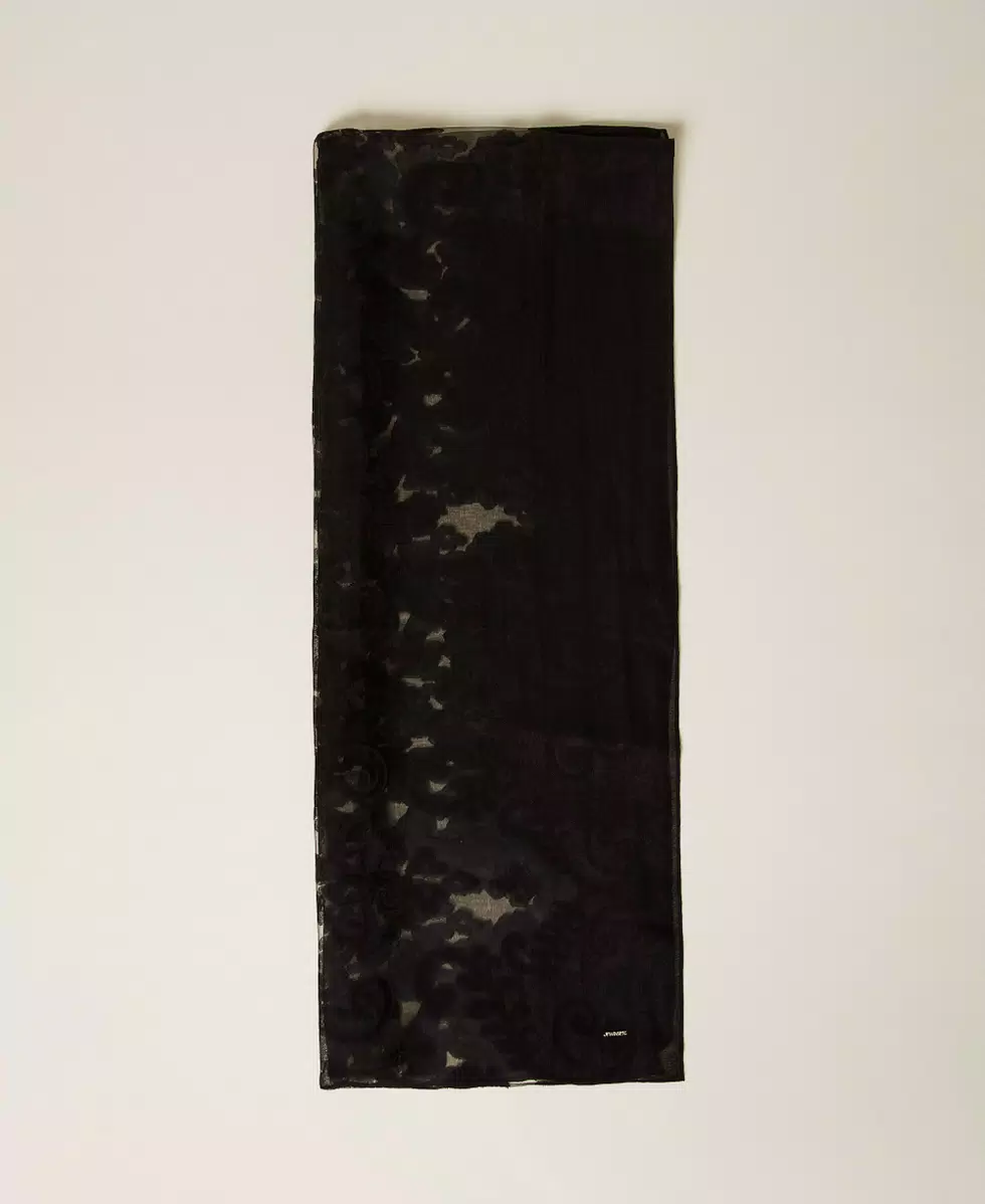 Stola in pizzo intarsiato con trasparenze personalizzata da targhetta logo.