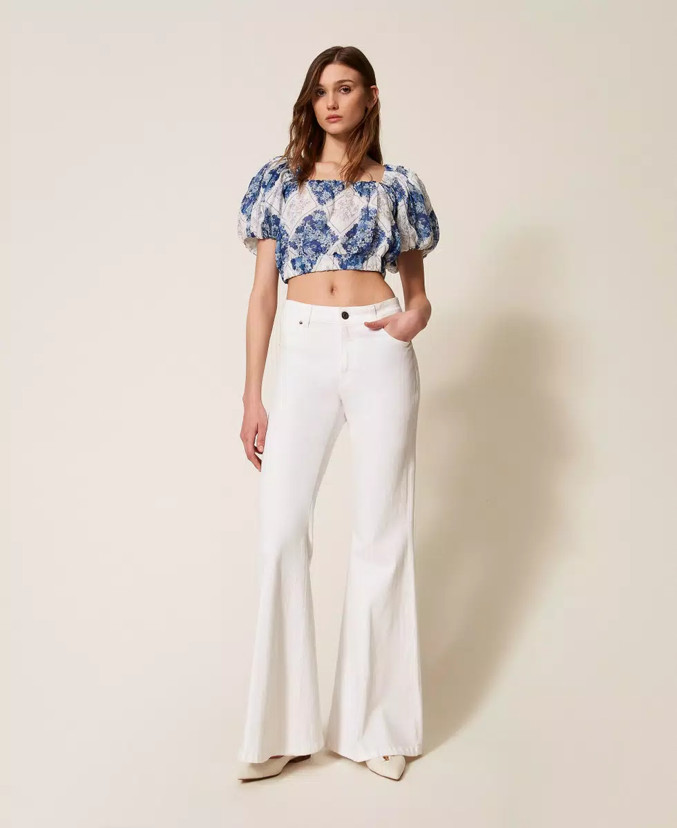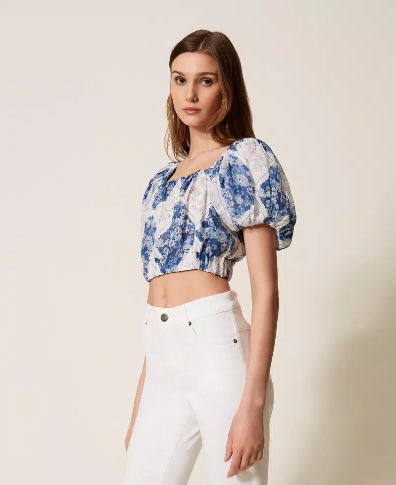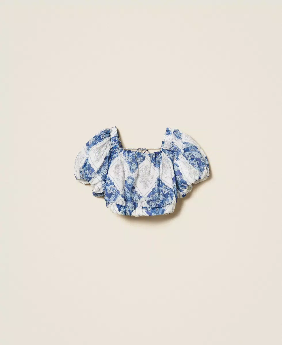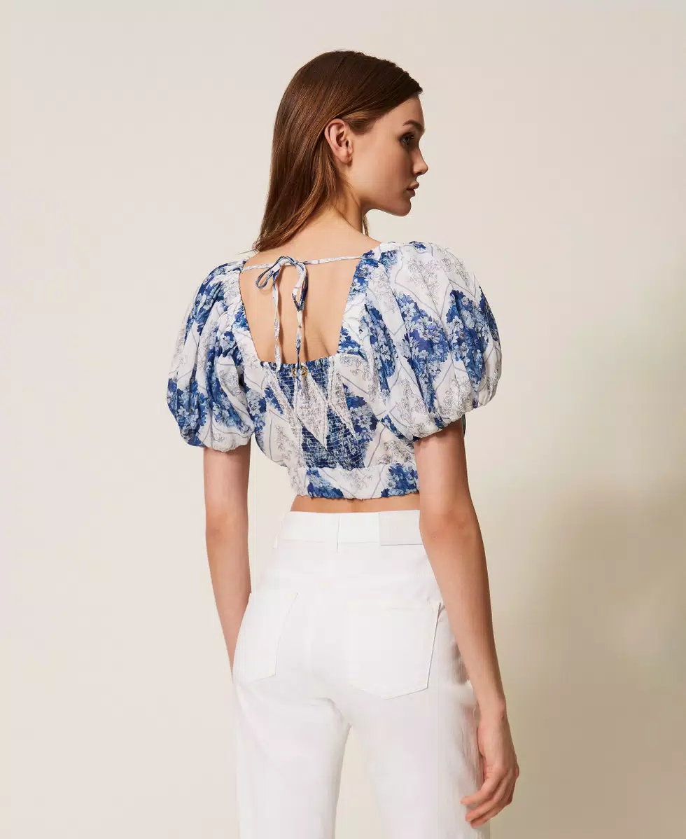 Blusa cropped made in Italy in ramiè con stampa losanghe a fantasia floreale, esclusiva Twinset. Ha collo squadrato, maniche corte a palloncino, elastico in vita dall'effetto blusante, linea morbida.