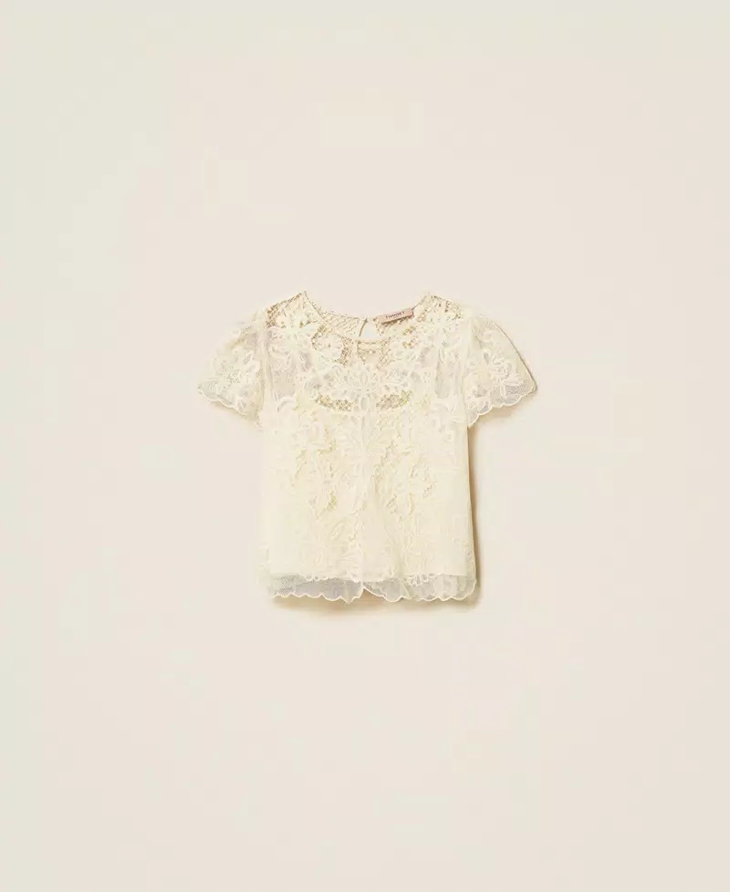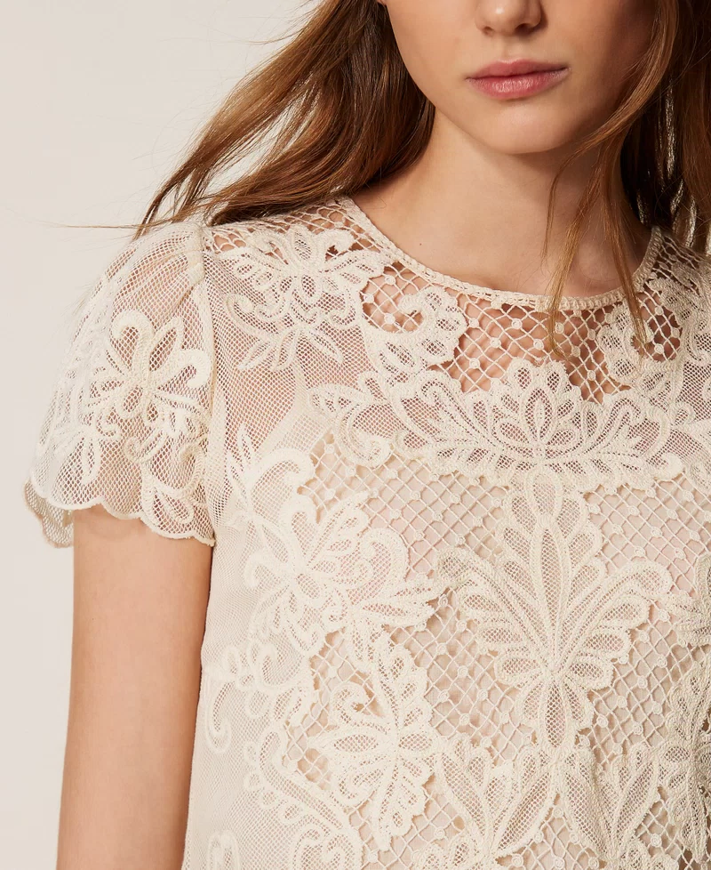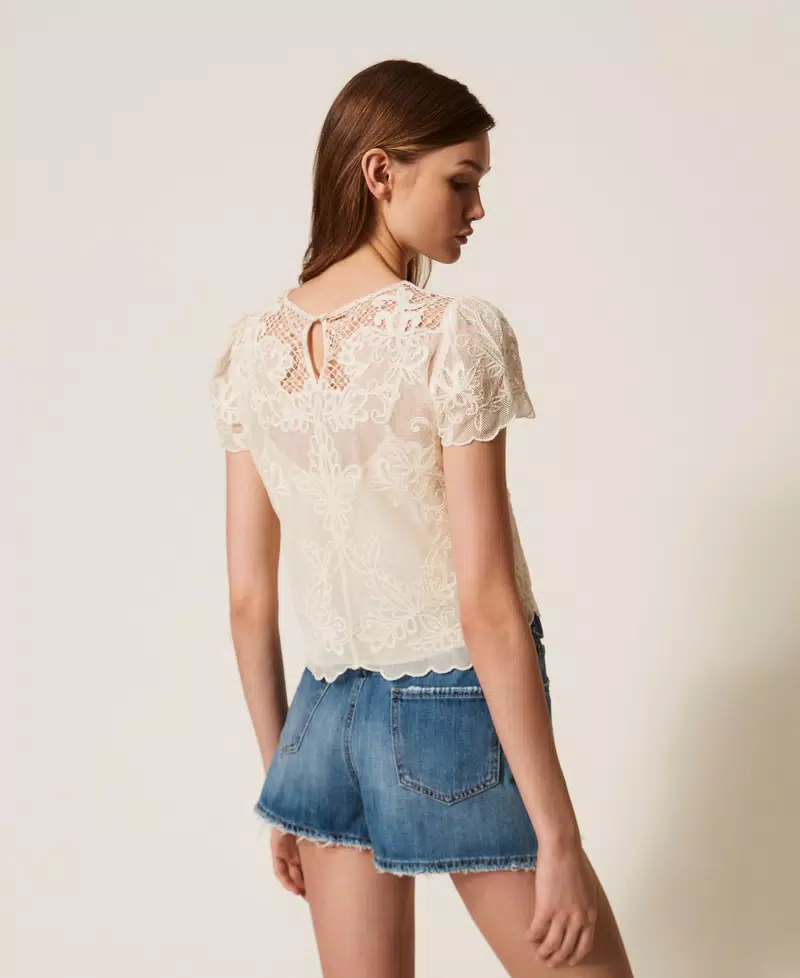 Blusa in mussola di misto cotone con ricamo realizzato con speciale tecnica Dori. Ha collo tondo, maniche corte e fondo smerlati, apertura a goccia con bottone sul retro, top rimovibile abbinato, linea dritta