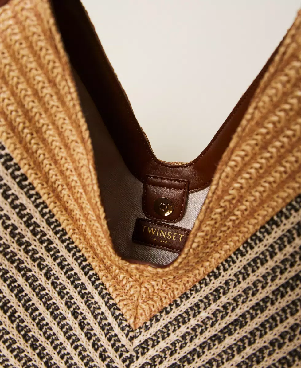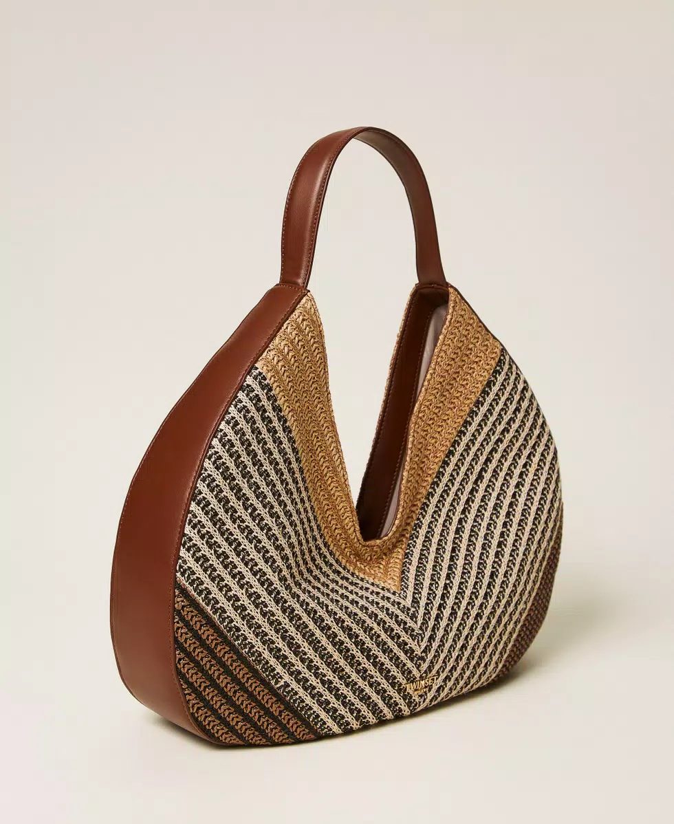 Borsa hobo jacquard in rafia e cotone bicolore lavorato a telaio, assemblati a mano a creare un effetto patch. Ha chiusura con magnete, manico a spalla effetto pelle di vitello liscio in tinta, fodera, logo lettering in metallo.