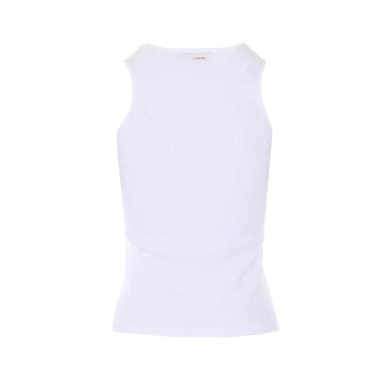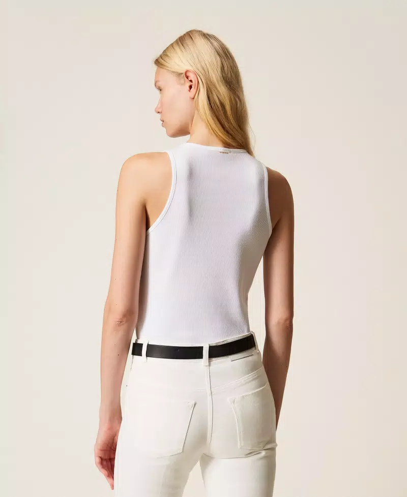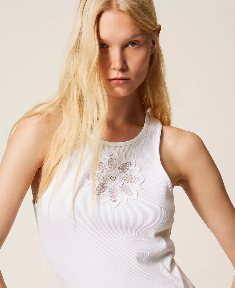 Canotta in cotone lavorato a costine con ricamo floreale a intarsio davanti d'ispirazione mandala. Ha collo tondo e linea fitted.