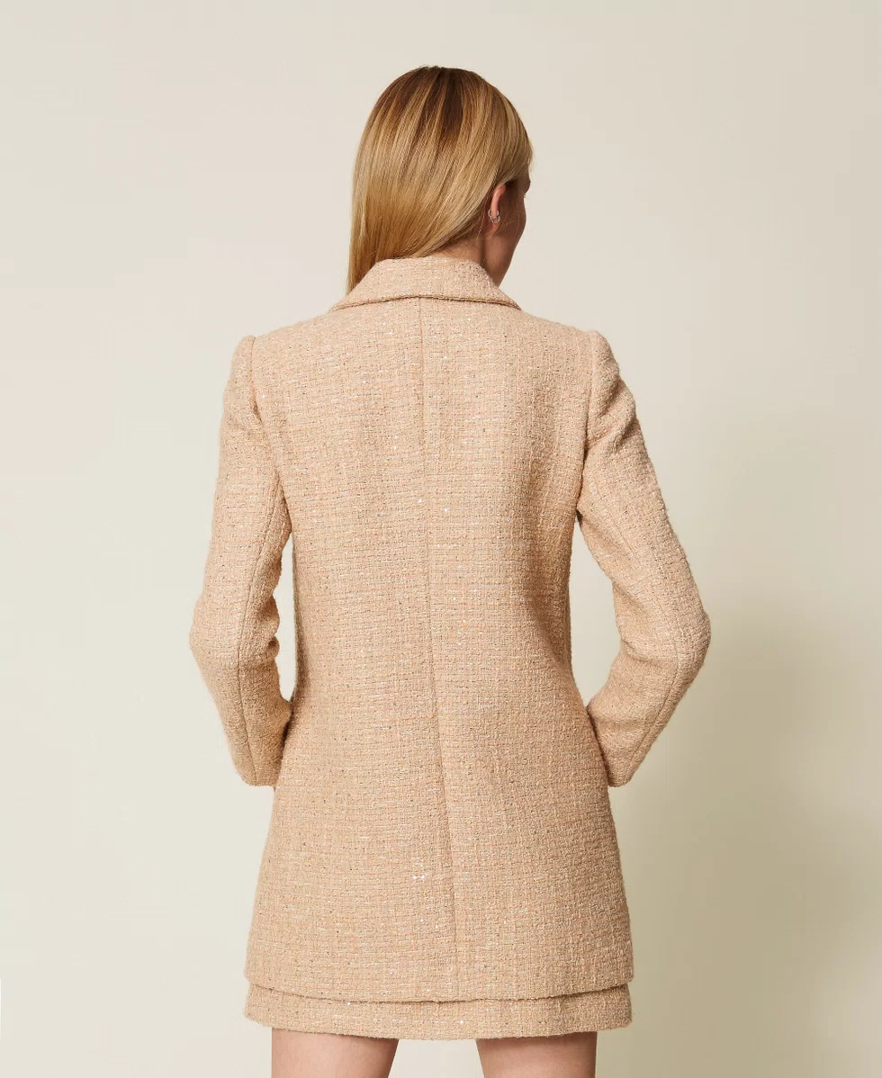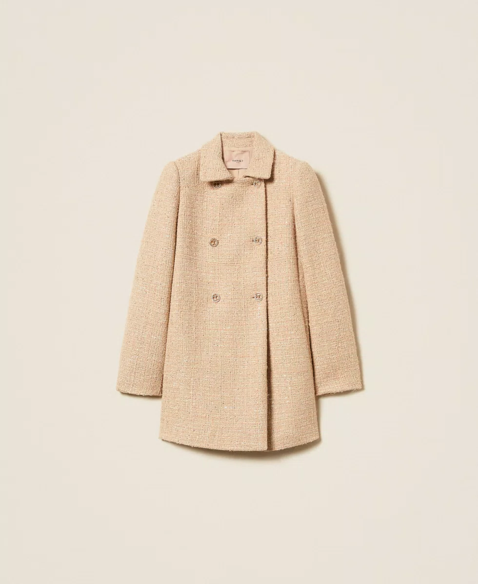 Cappotto corto in tessuto bouclé con fili lurex e paillettes inserite in trama. Ha colletto, chiusura doppiopetto con bottoni logati Oval T, maniche lunghe, tasche inserite ai fianchi, fodera, linea dritta.