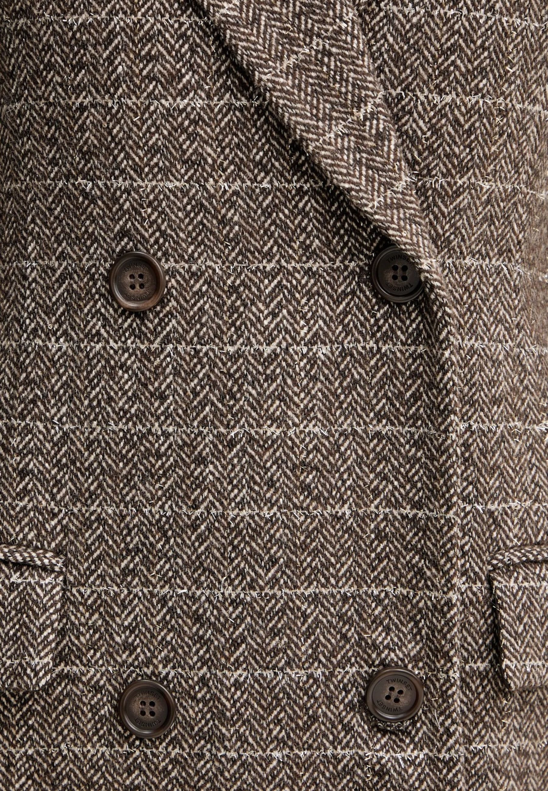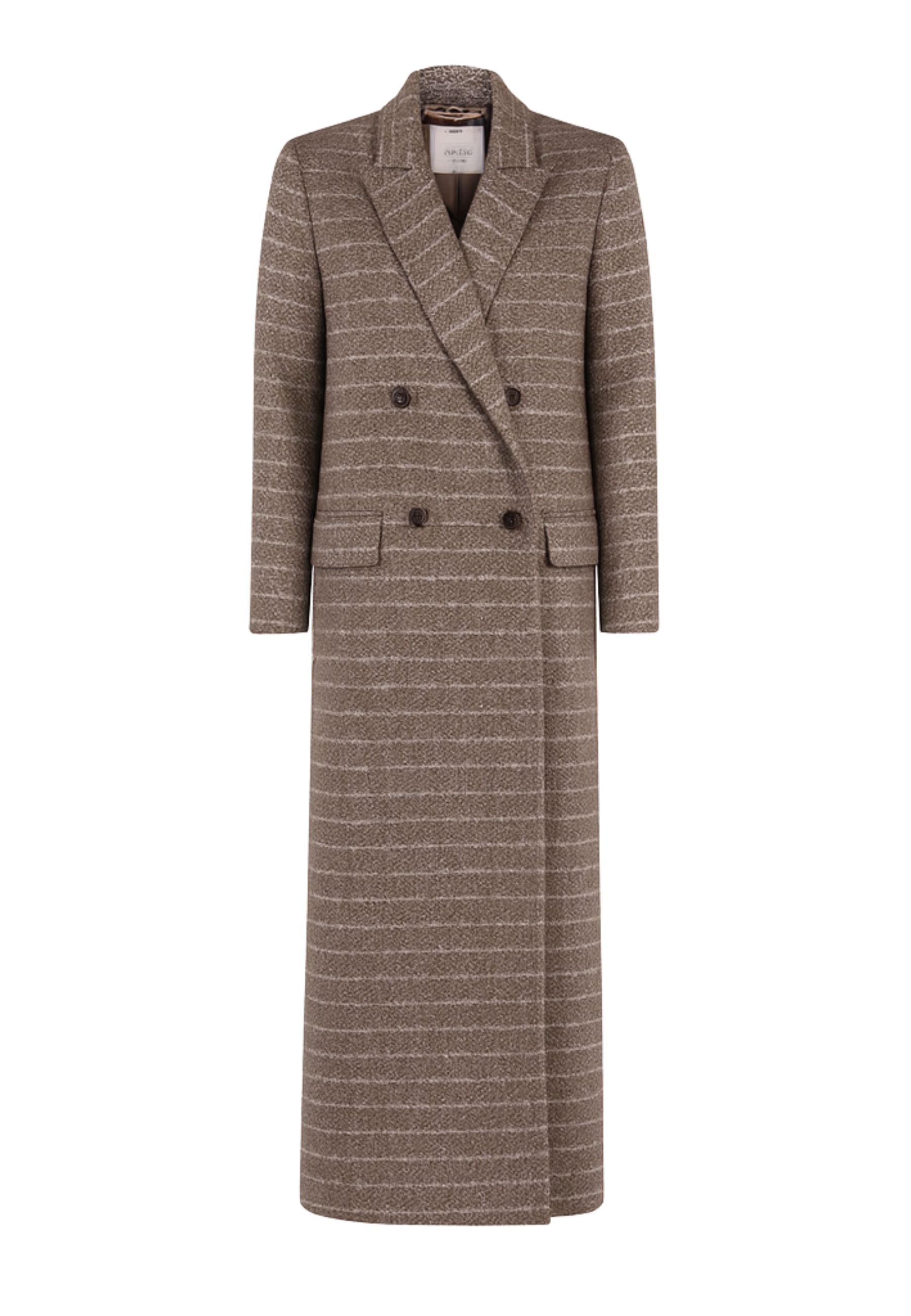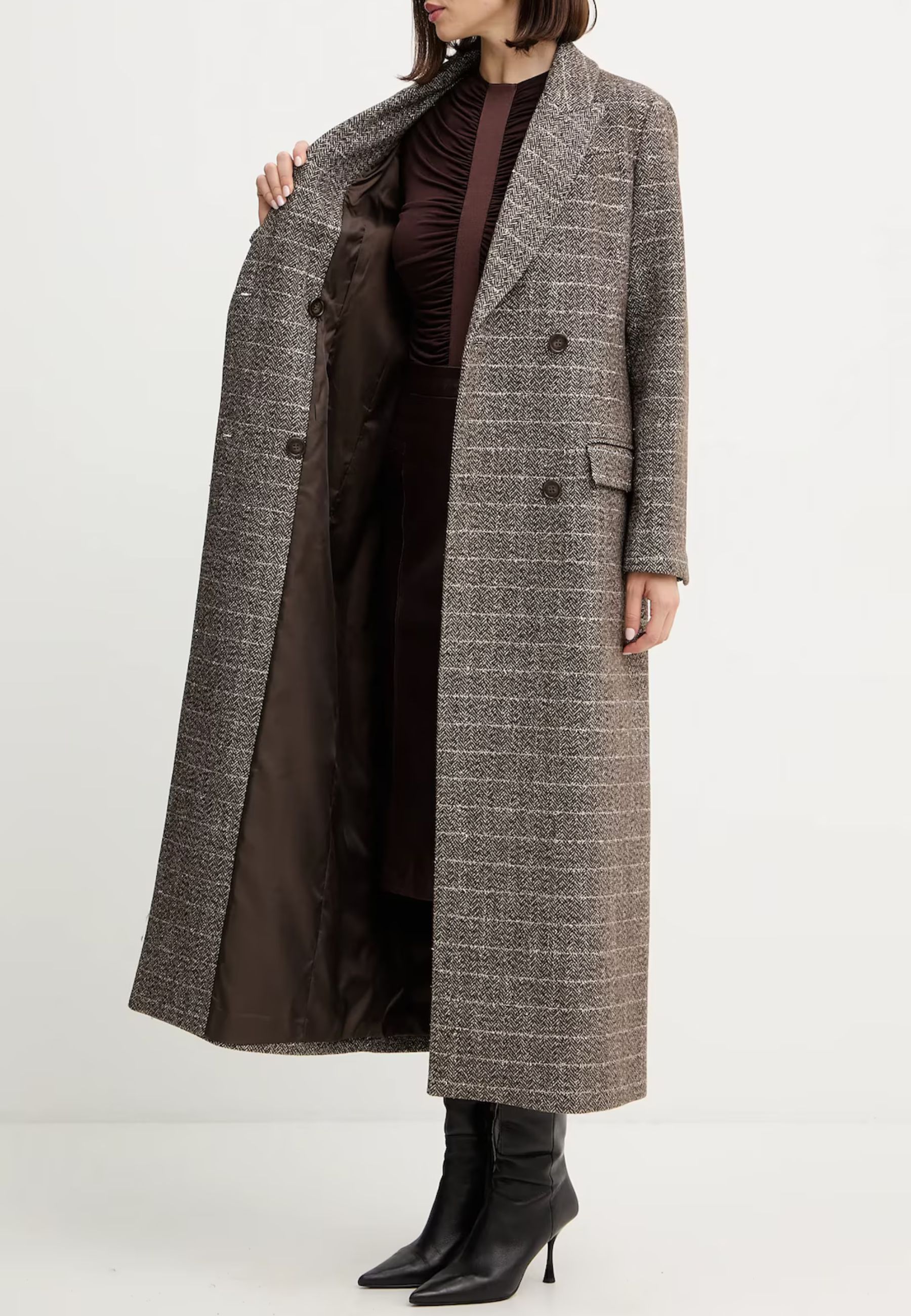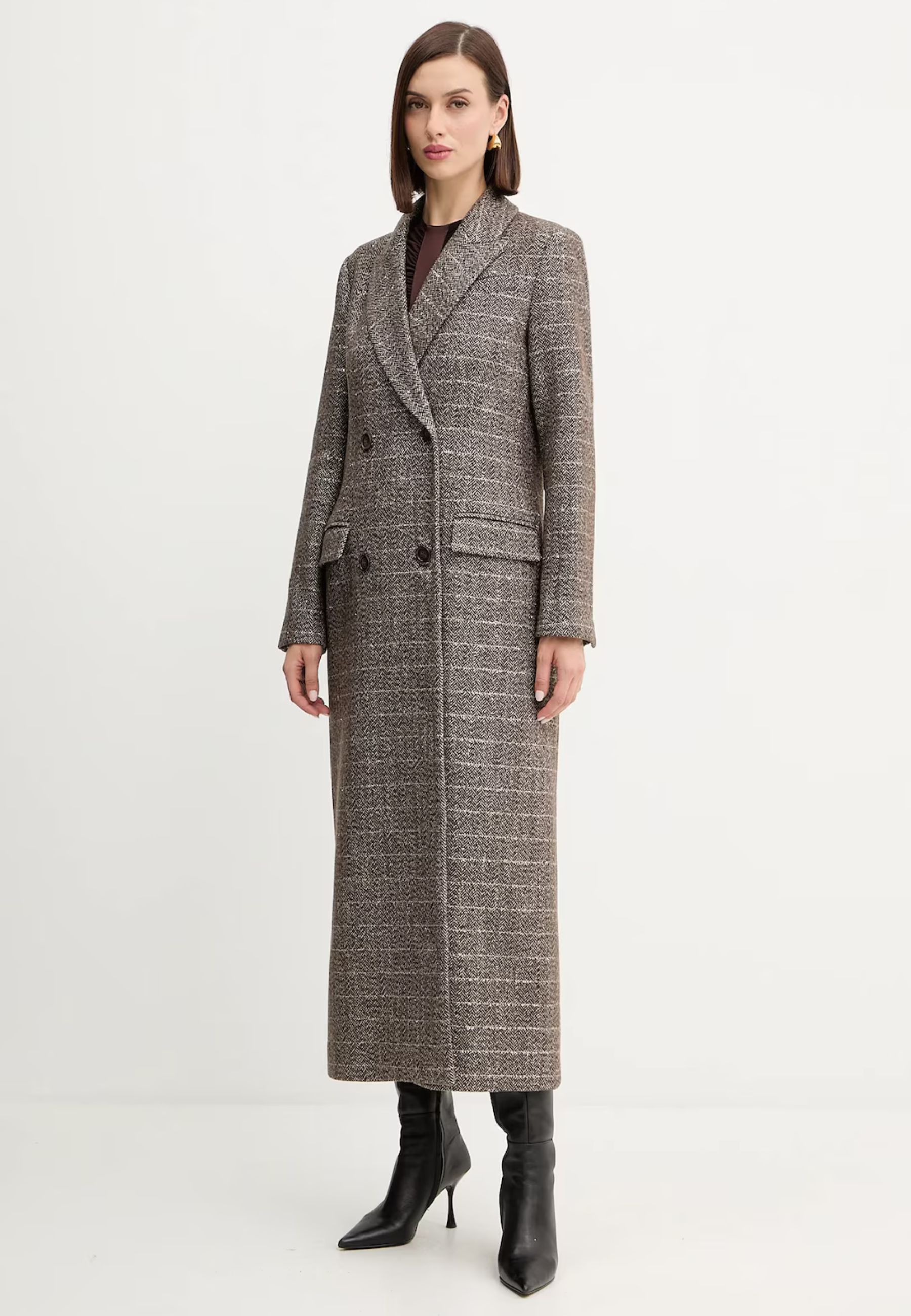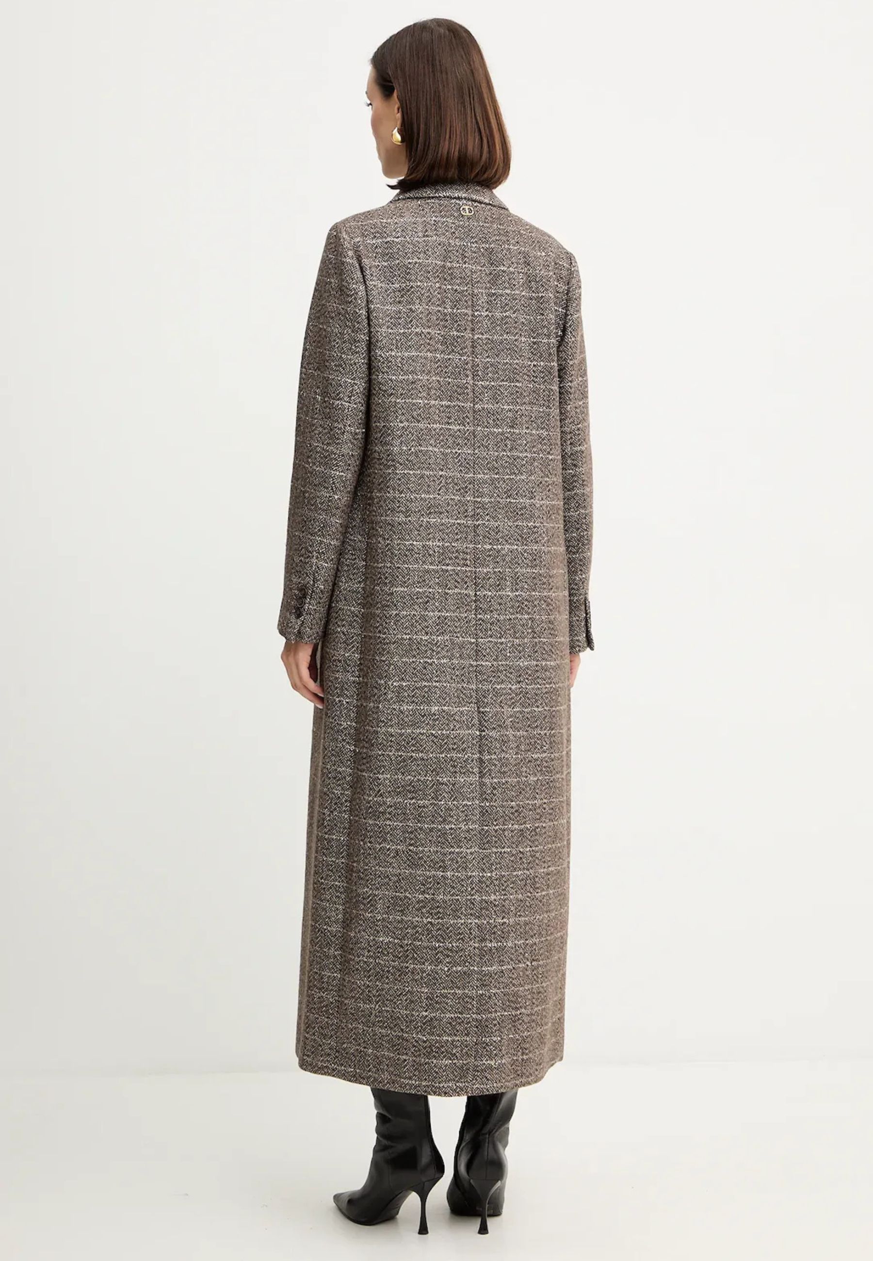 Cappotto lungo in tessuto di misto lana a fantasia chevron con lurex. Ha collo con revers, chiusura doppiopetto con bottoni, maniche lunghe, tasche a filetto con pattine, spacco al fondo sul retro, fodera, placchetta logo Oval T sul retro, linea dritta.