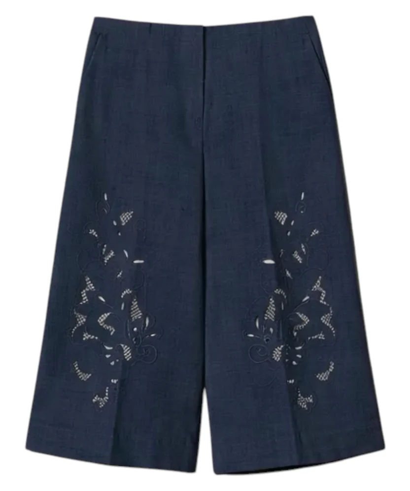 Pantaloni cropped in misto lino e viscosa con ricamo floreale davanti. Ha chiusura con zip e bottone, tasche ai fianchi, piega stirata, linea ampia.