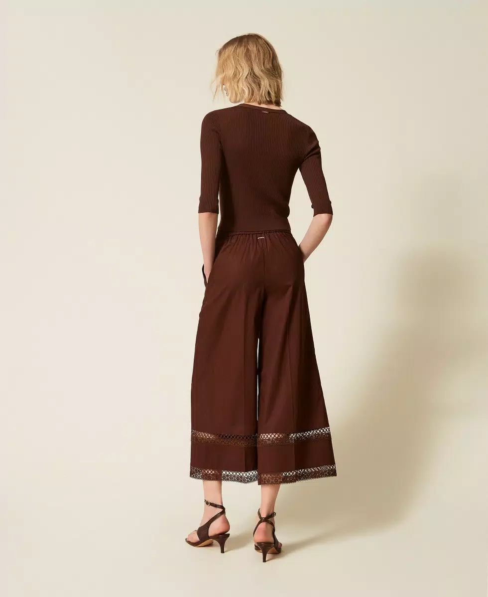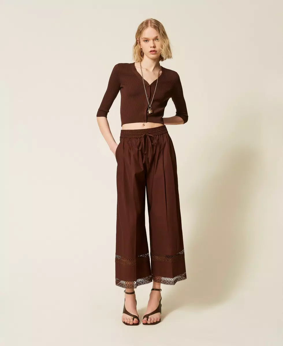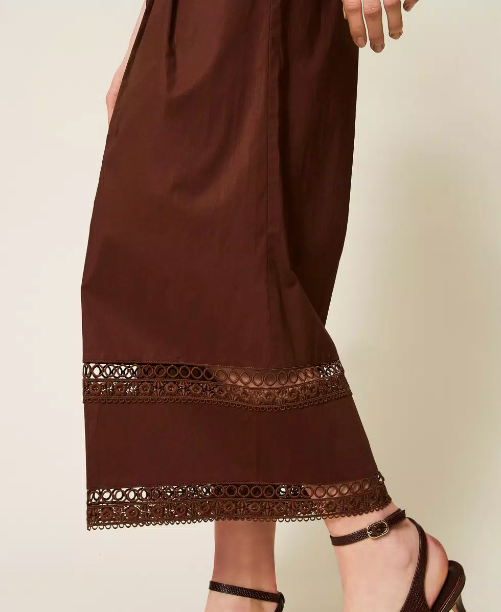 Pantaloni in popeline di cotone stretch con inserti di passamanerie ricamate al fondo. Ha elastico in vita con coulisse, tasche ai fianchi, linea ampia.