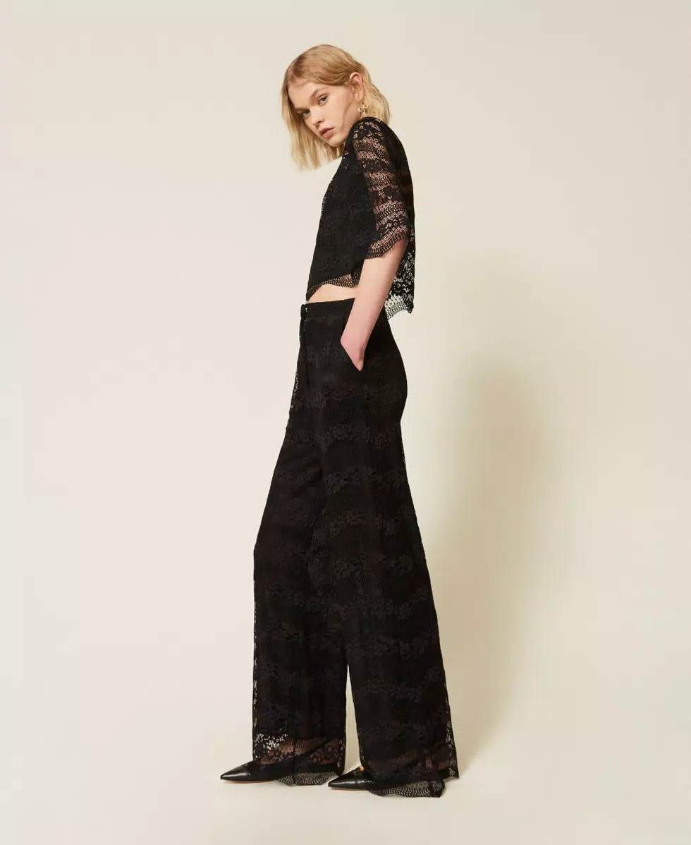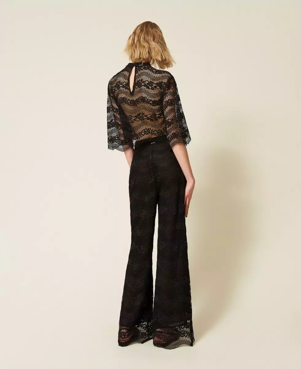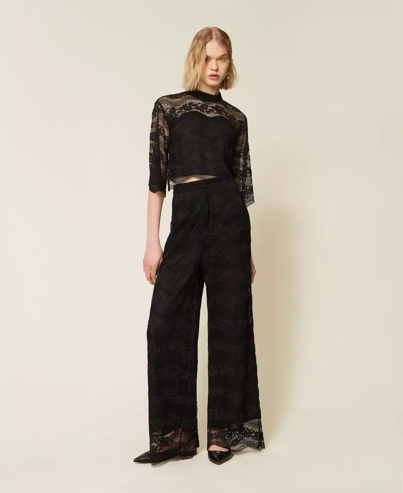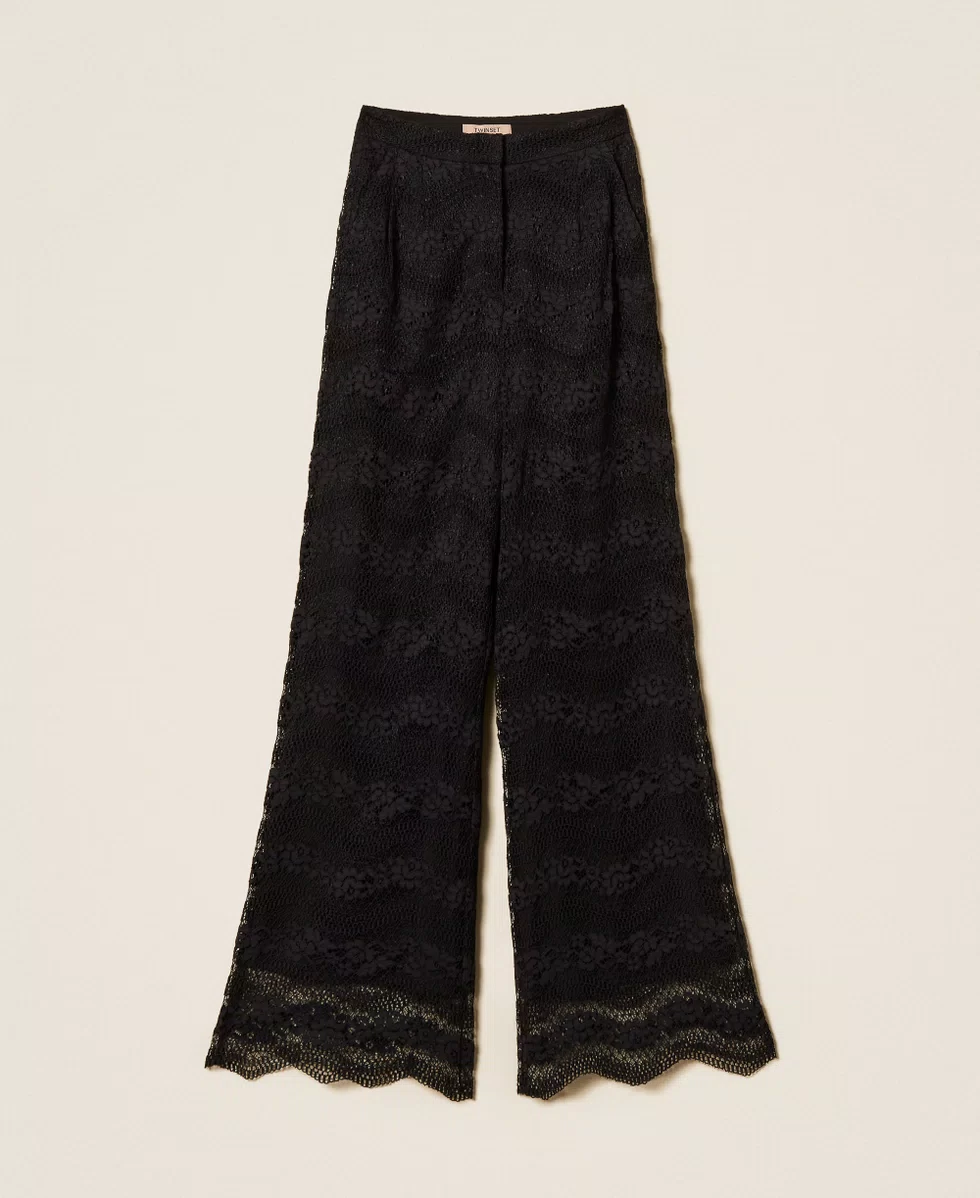 Pantaloni in pizzo macramè con motivo a onde. Ha chiusura con zip e gancio a uomo, fondo smerlato, fodera, linea ampia.