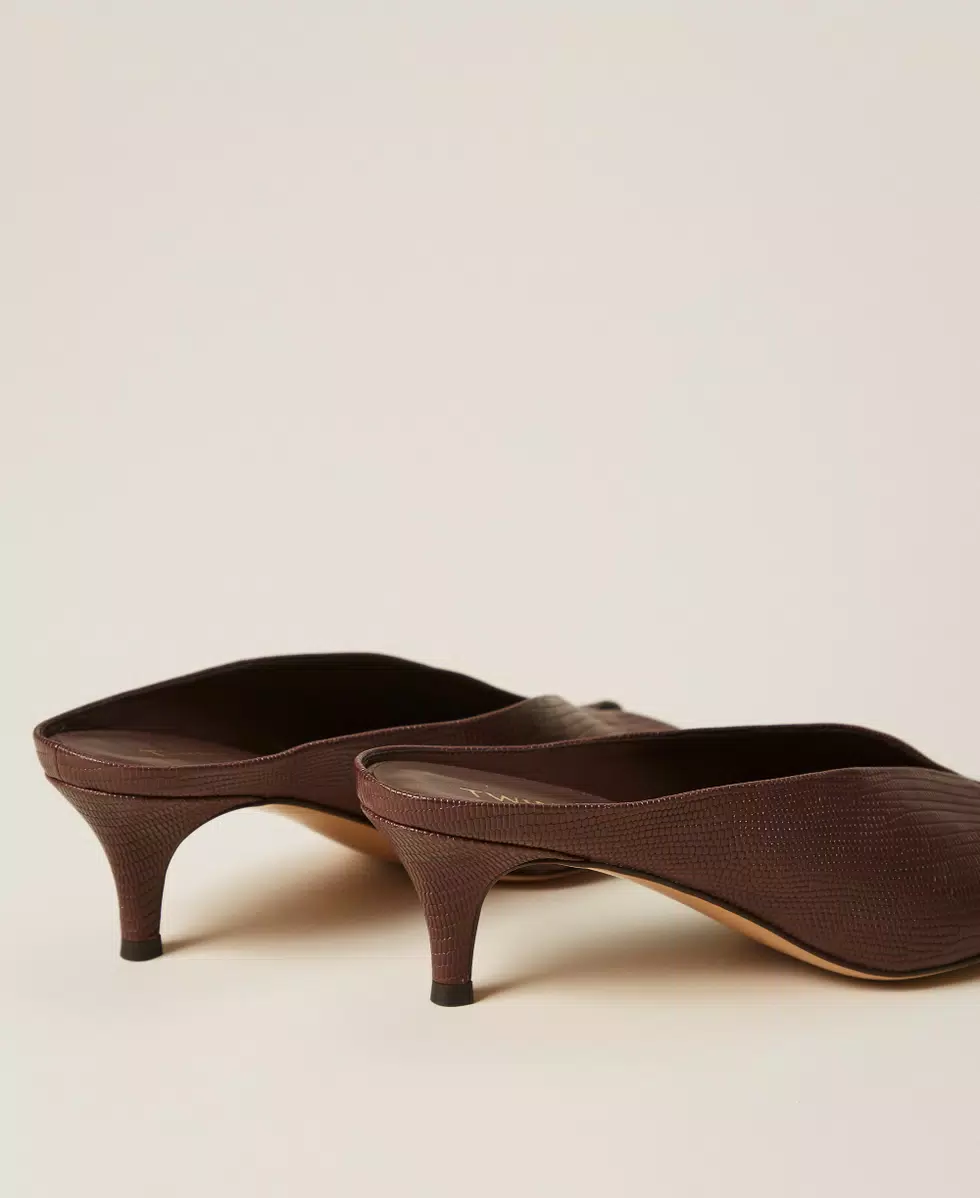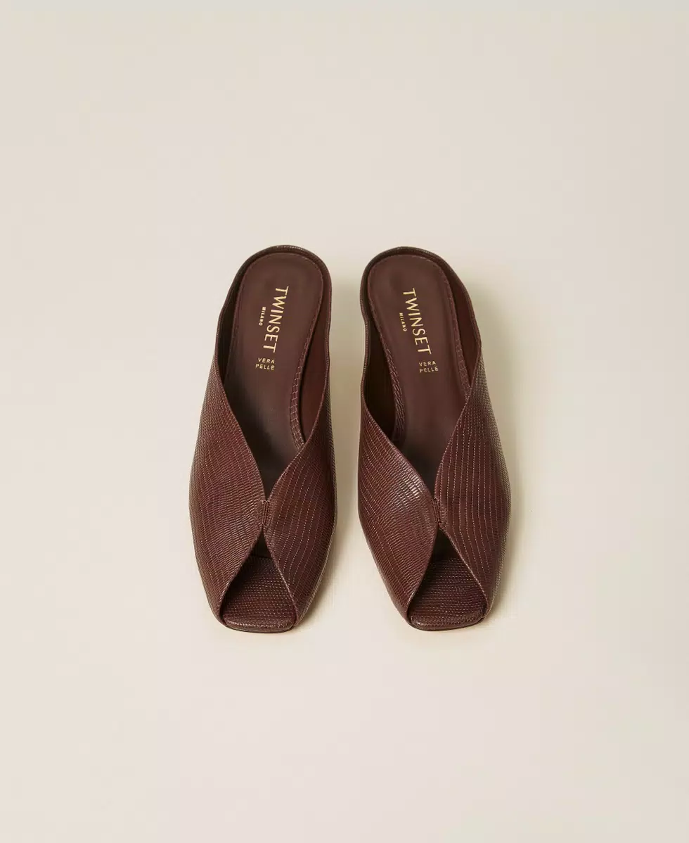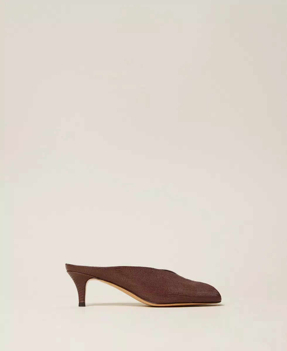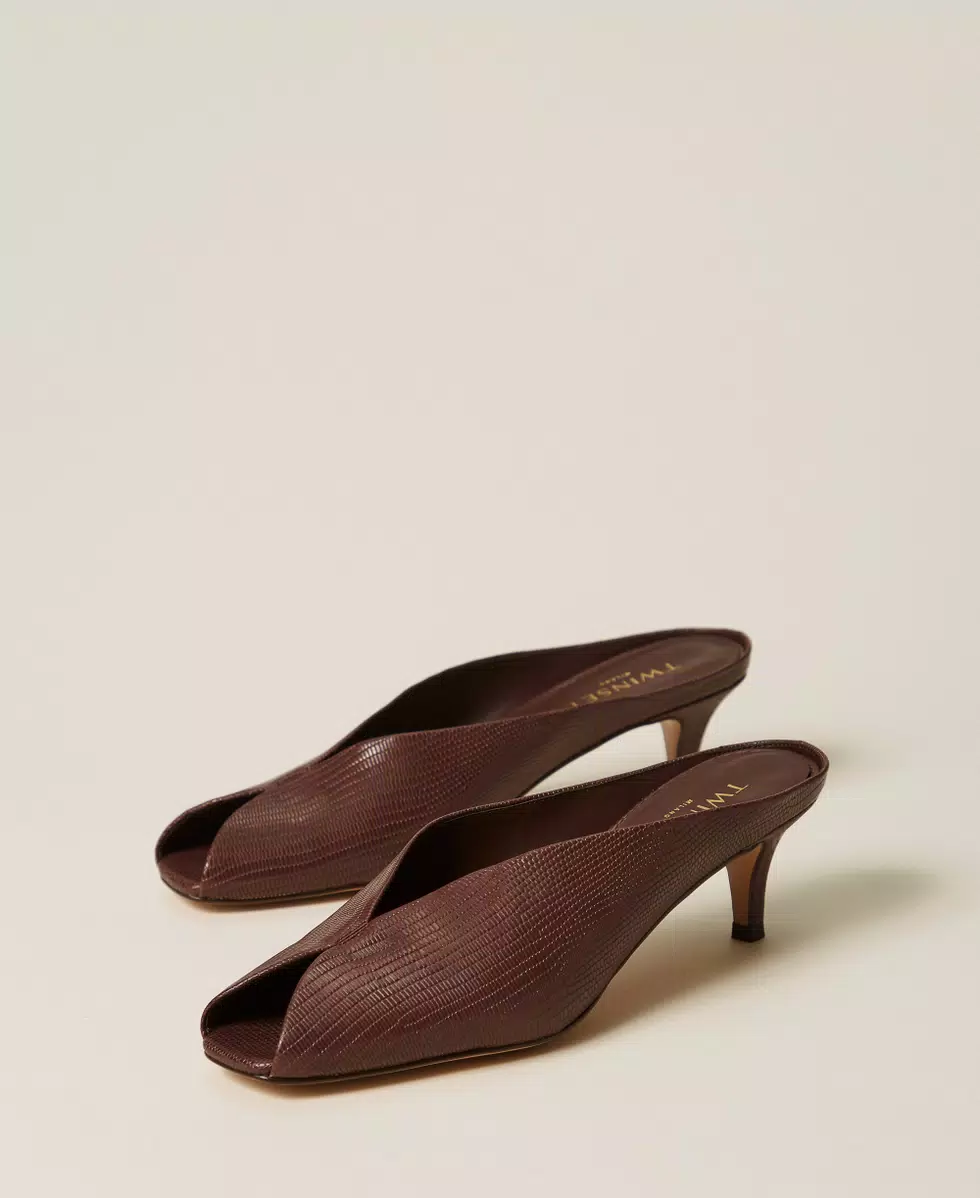 Scarpe mules in pelle con stampa tejus, costruzione open toe, tacco fasciato in pelle, fondo in tunit.