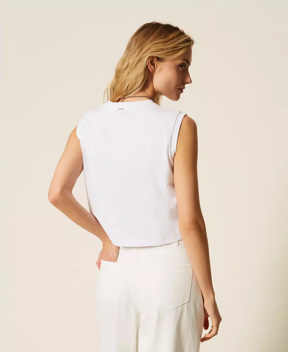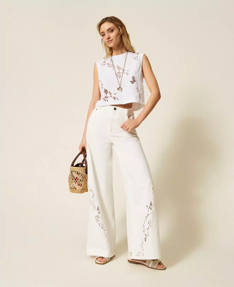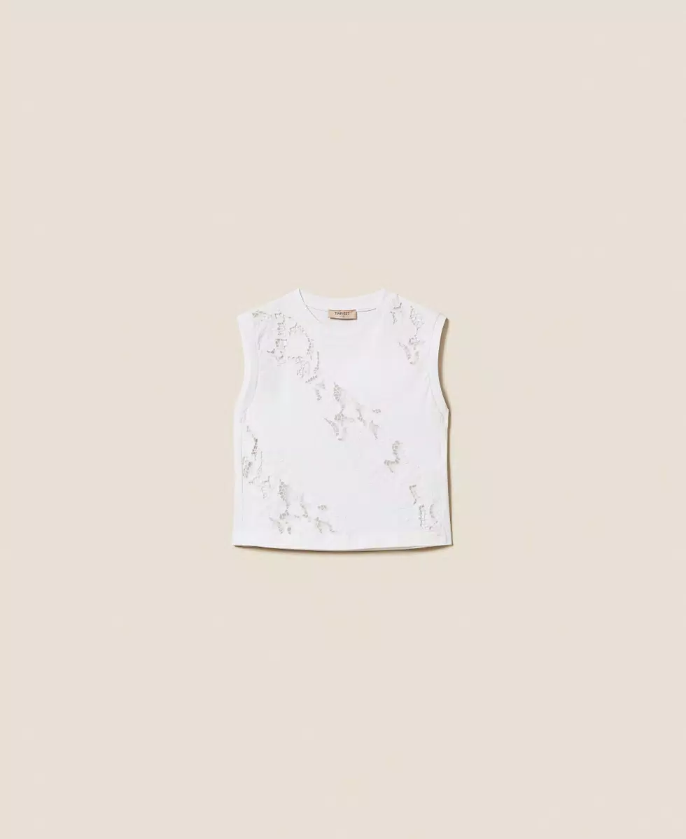 T-shirt in jersey di puro cotone con ricamo sangallo inserito in bande diagonali. Ha collo tondo, placchetta logo sul retro, linea regular.