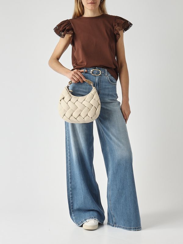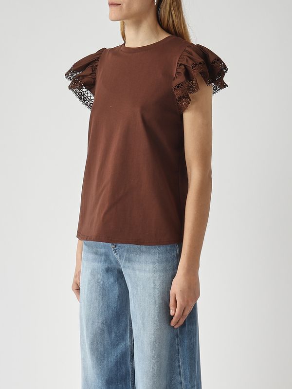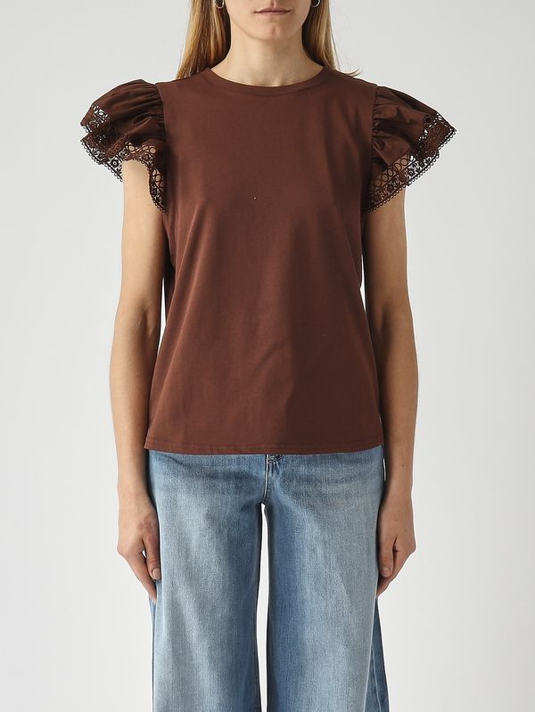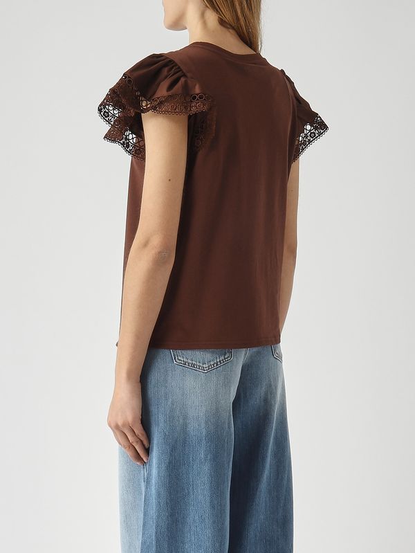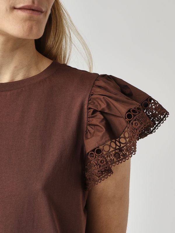 T-shirt in jersey di puro cotone con maniche corte ad aletta arricciate rifinite da passamaneria in pizzo, collo tondo, linea regular.