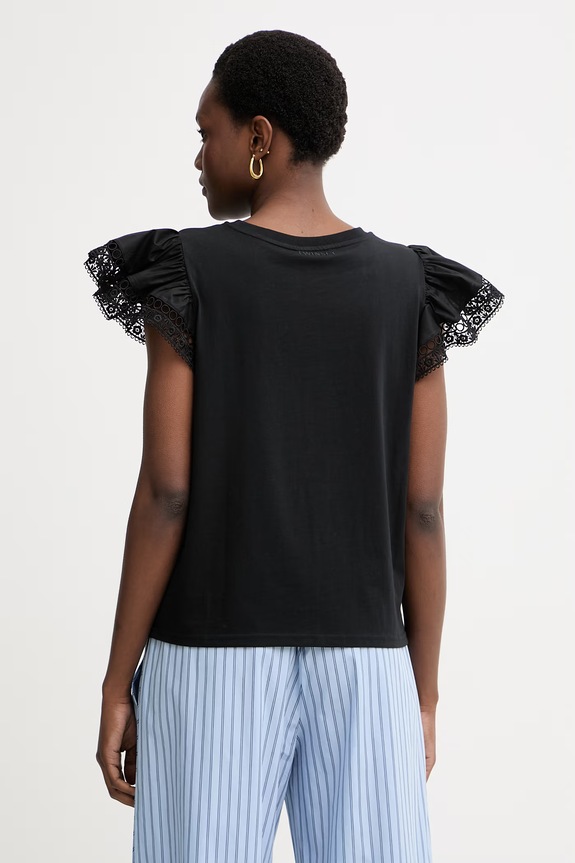 T-shirt in jersey di puro cotone con maniche corte ad aletta arricciate rifinite da passamaneria in pizzo, collo tondo, linea regular.