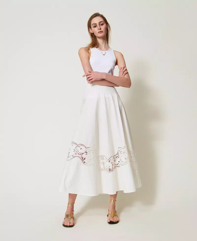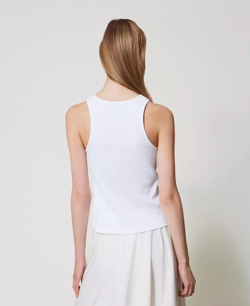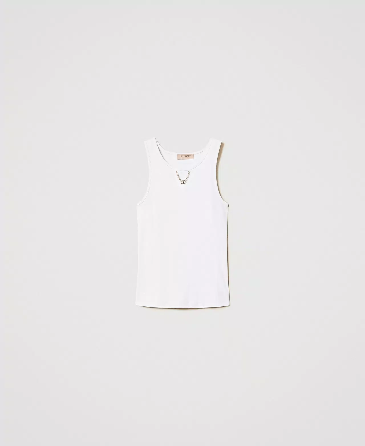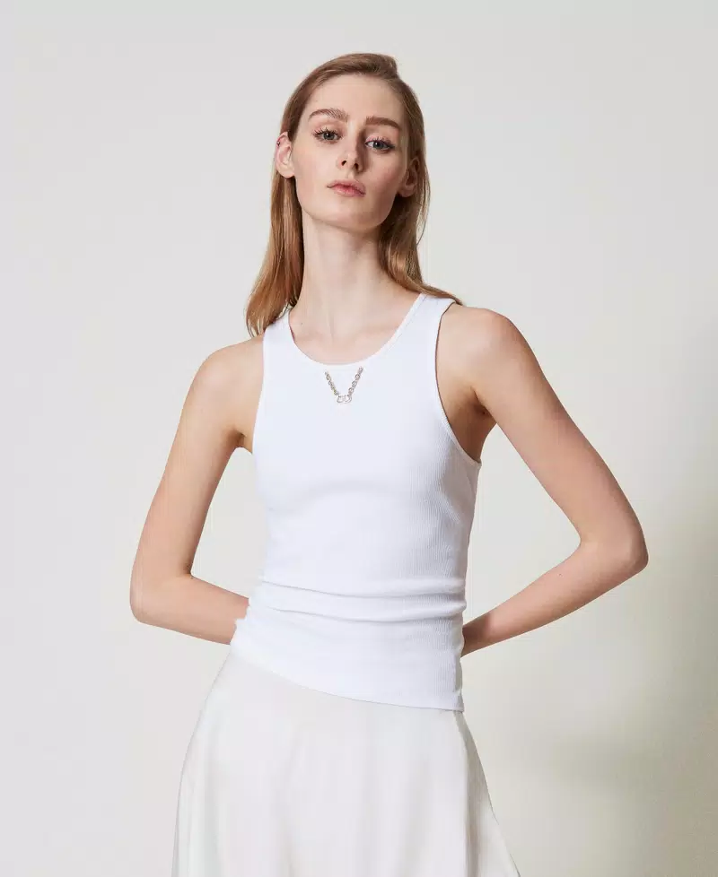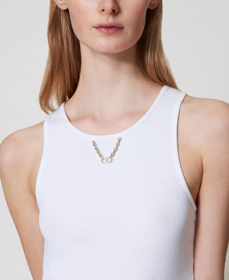 Top in cotone a costine con collo tondo, catena inserita in metallo con logo Oval T e linea fitted.